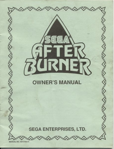 Sega After Burner arcade game Owner's Manual. Includes game operating information, wiring, dipswitch settings and related information.
