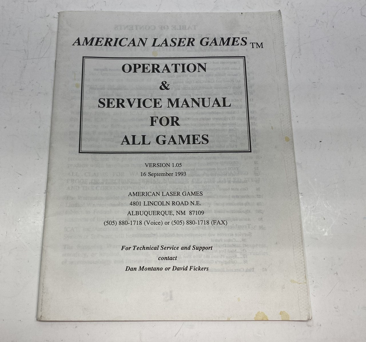 Original American Laser Games arcade game Operation & Service Manual for All Games. This manual is for their laser disc based games such as Mad Dog McCree, Crime Patrol and the Last Bounty Hunter.
