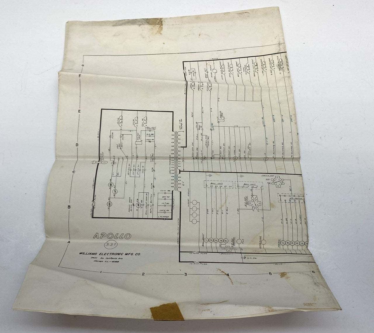 Original Williams Apollo pinball machine schematic/wiring diagram from 1967 with some wear but usable.