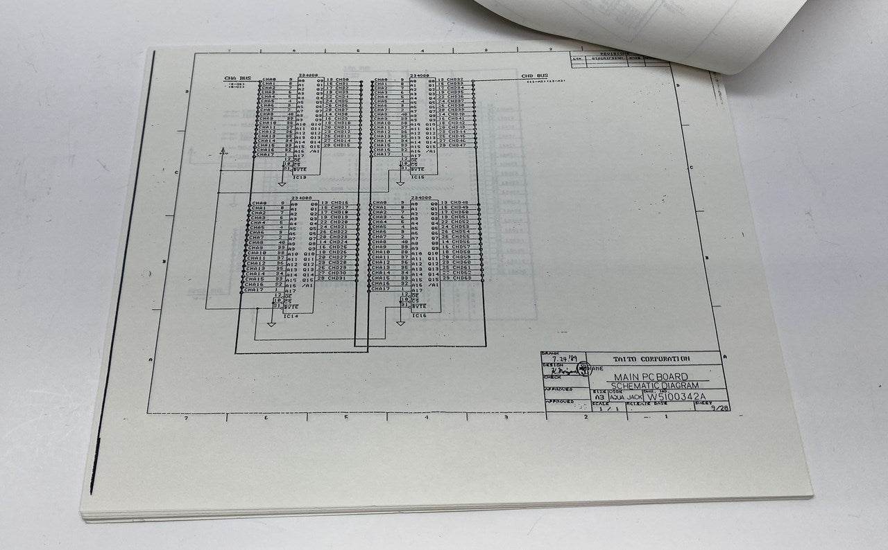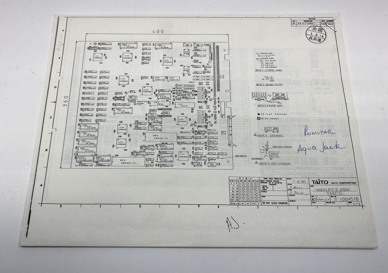 Taito Aqua Jack Warrios circuit board schematic sheets. We don't believe these were distributed with the game itself and are fairly hard to find.