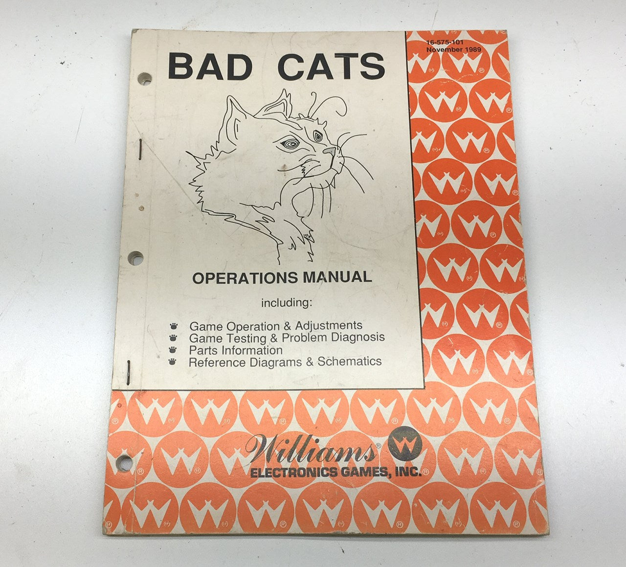 Original Williams Bad Cats pinball machine Instruction Manual in good condition. Includes game operating information, parts lists and schematics among other information.
