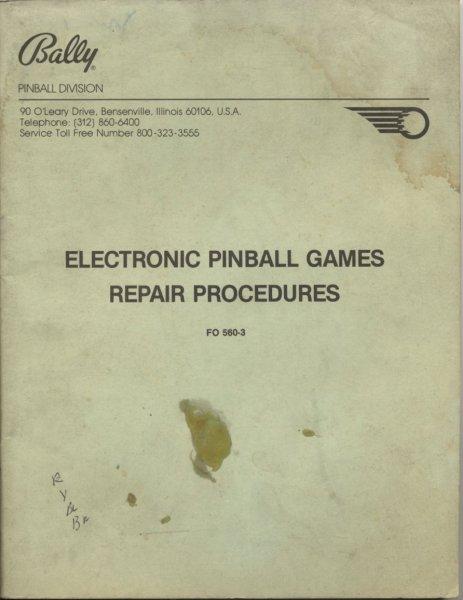 Original Bally Electronic Pinball Games Repair Procedures manual. Published in the early 1980s, this manual includes repair information on Bally pinball machines manufactured in the mid 70s through early 80s. This is an original manual in good condition.
