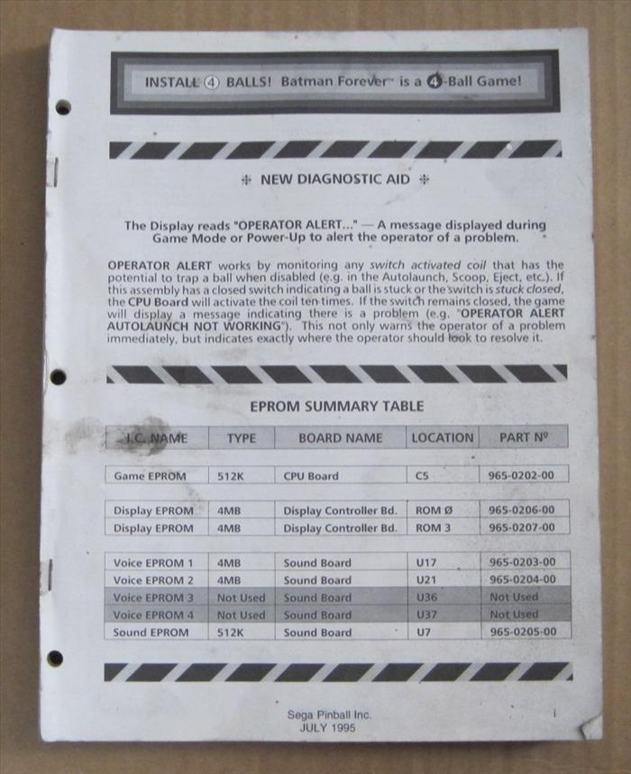 Original Sega Batman Forever pinball manual. Includes operations and adjustments info, testing and problem diagnosis, parts information and wiring diagrams. This manual is missing the front cover, but othewise complete.