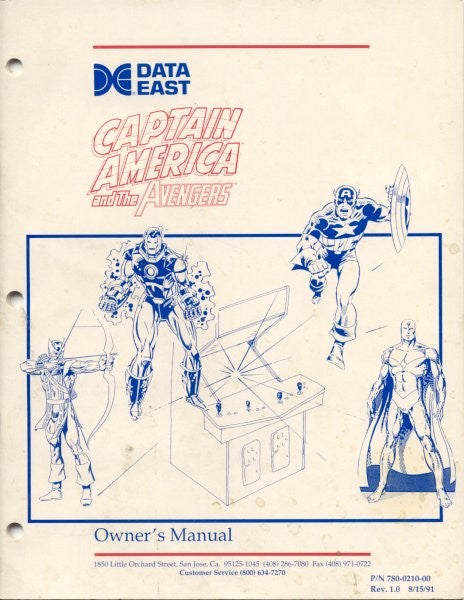 Data East Captain America and the Avengers arcade game instruction manual (dedicated version). Includes game operation information, dipswitch settings and wiring diagrams among other things.