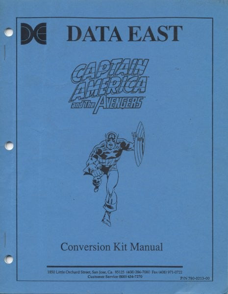 Data East Captain America and the Avengers arcade game instruction manual (conversion kit version). Includes game operation information, dipswitch settings and wiring diagrams among other things.