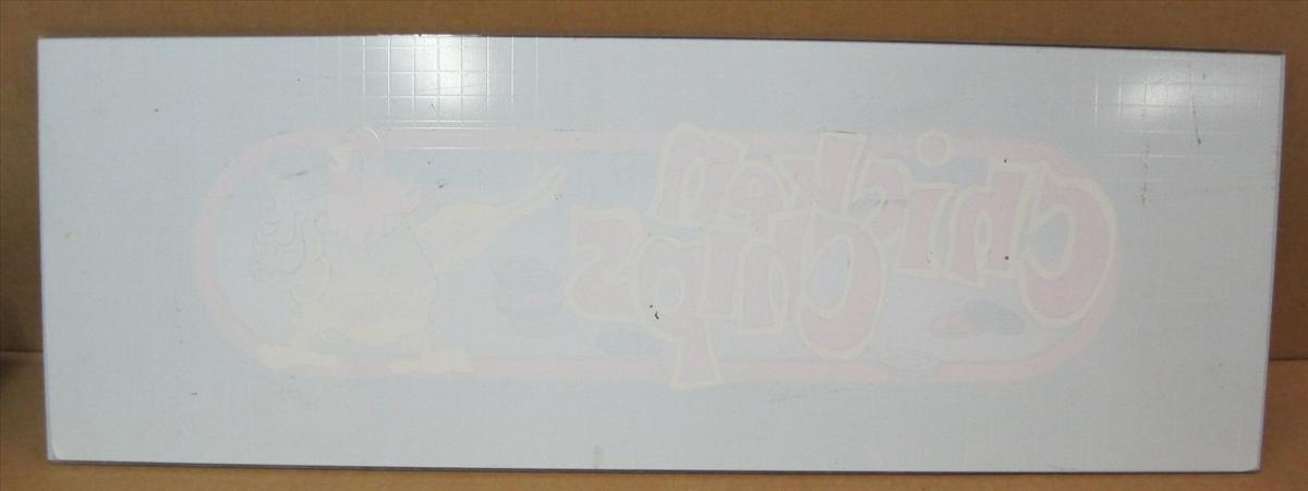 New old stock (NOS) Merit Chicken Chips arcade game plexi marquee. This marquee does have some minor wear on the back from sitting over the years, but the protective plastic is still intact on the front. Measures 26 1/16" x 9 1/16". See pictures for more details on its condition.