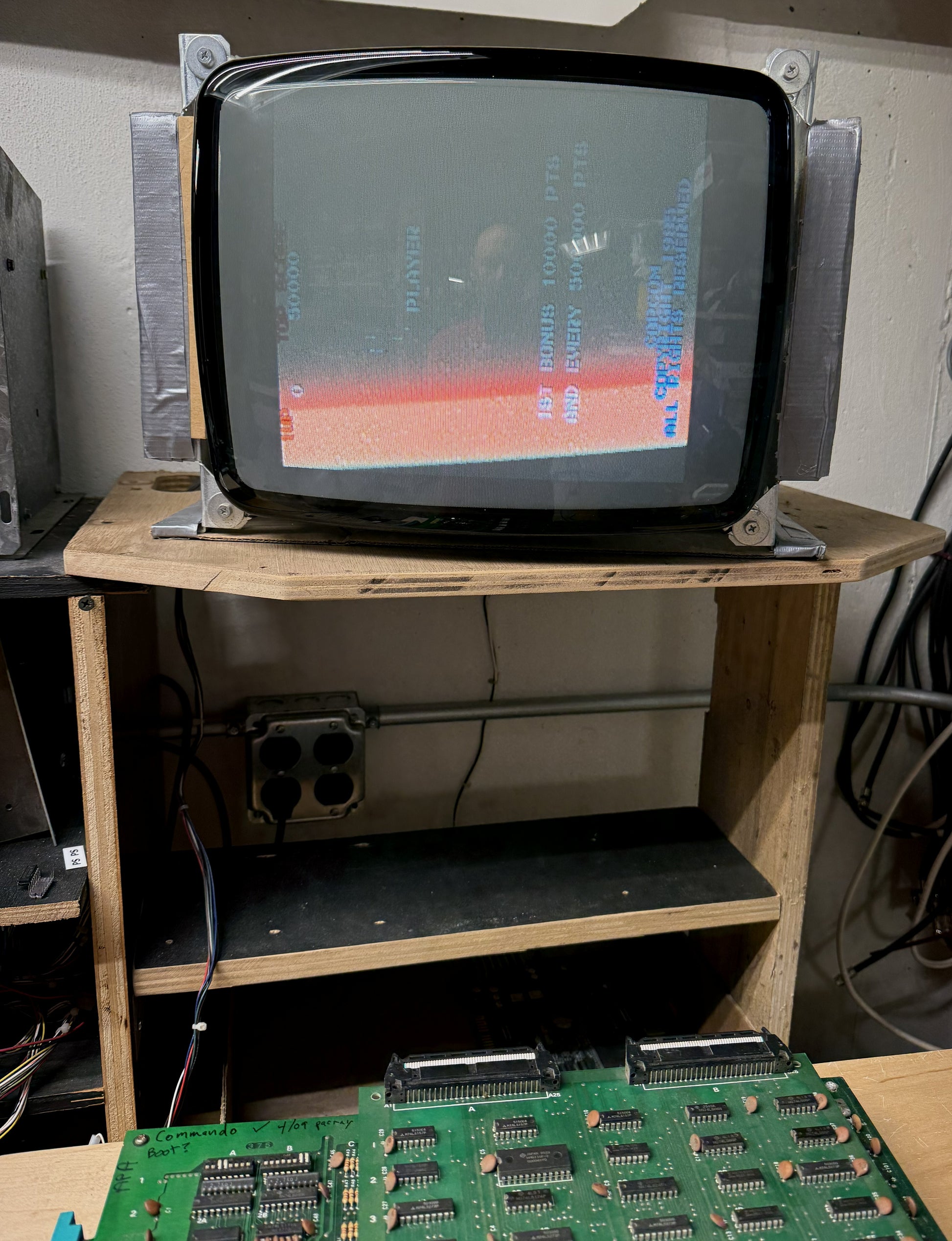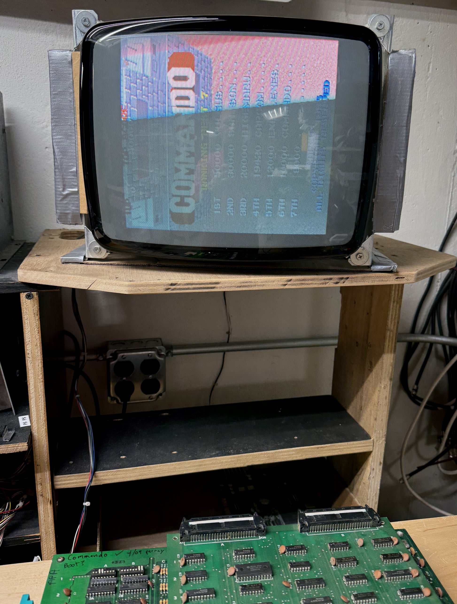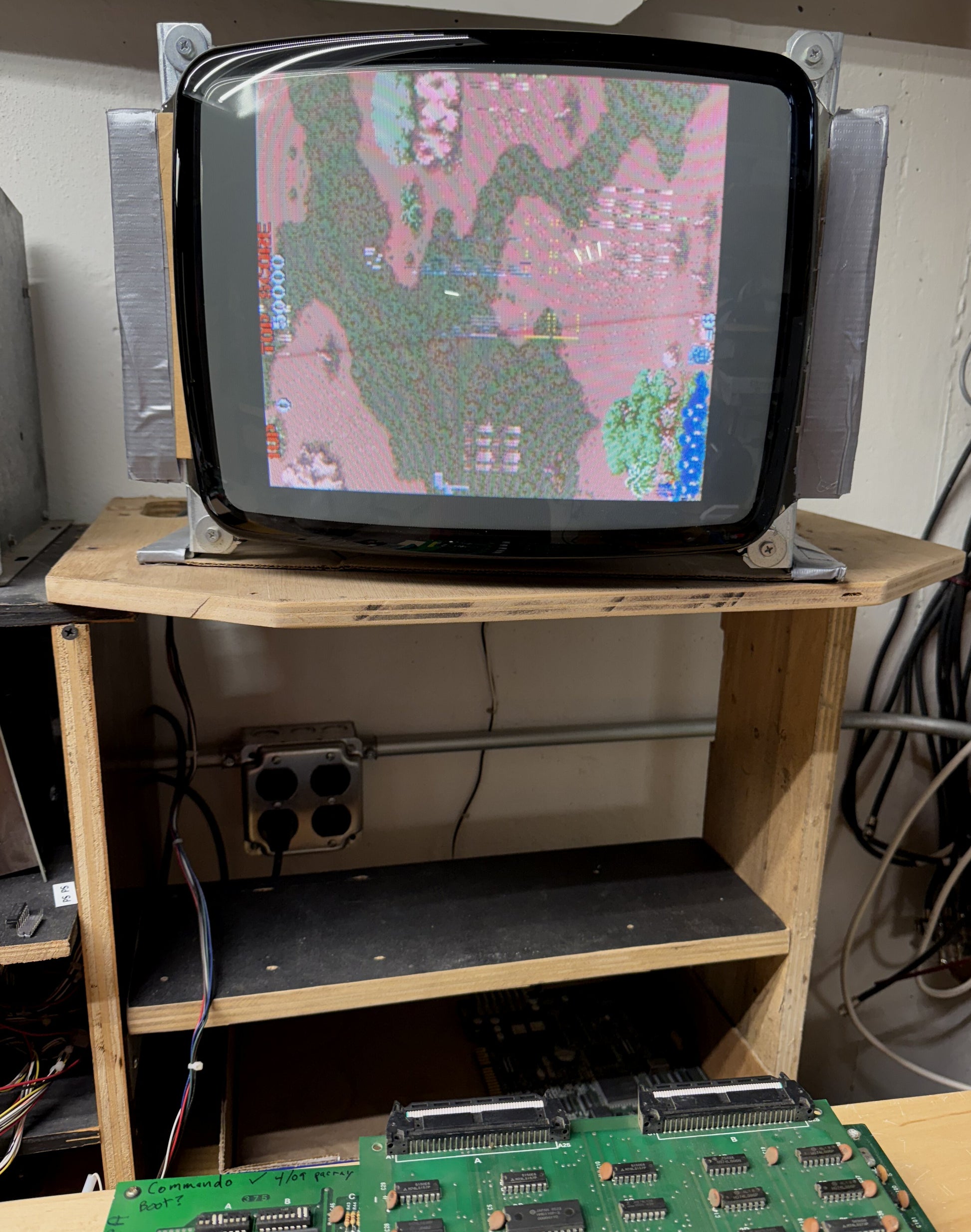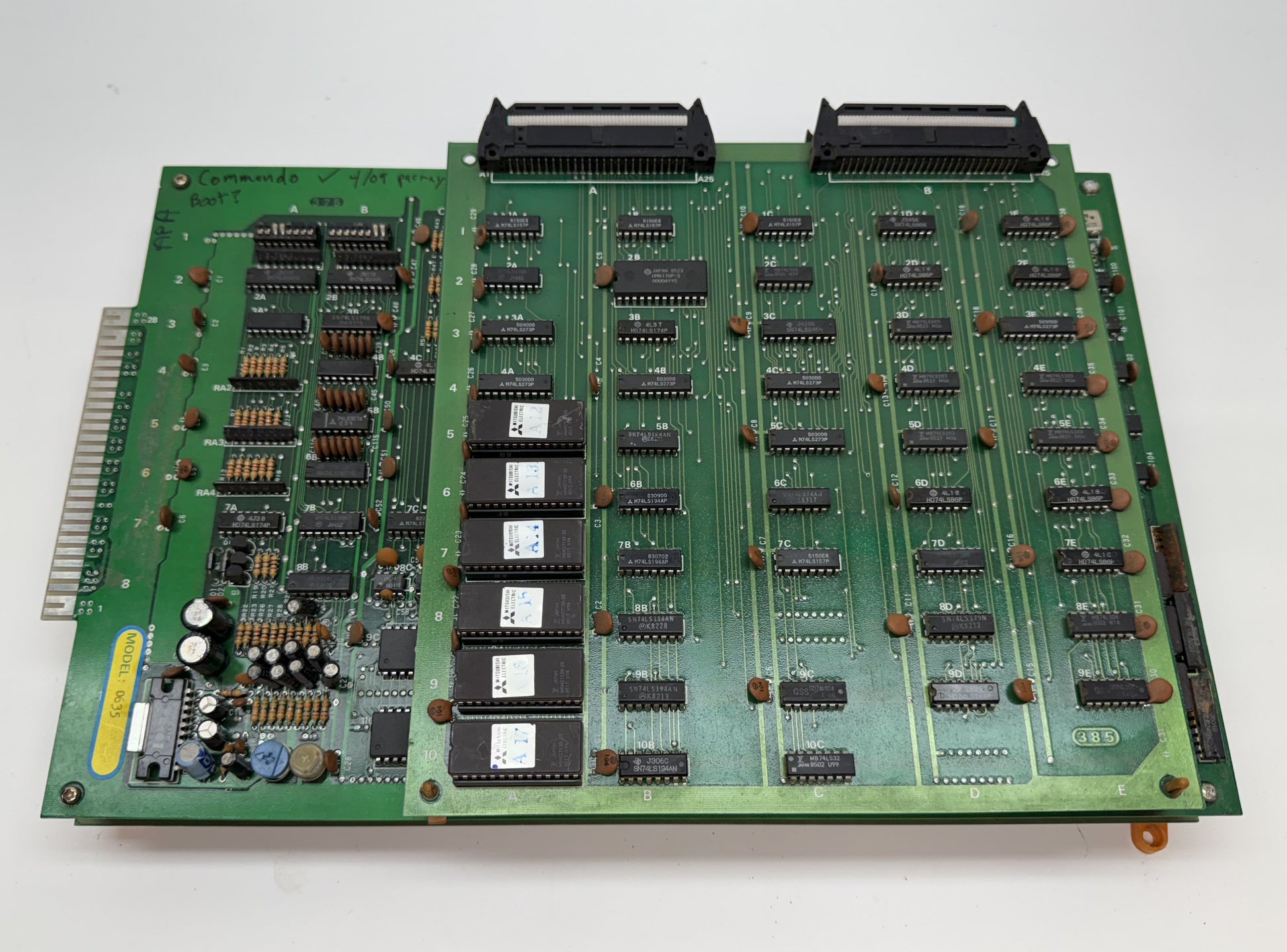 Aftermarket (bootleg) Capcom Commando arcade game circuit boardset that boots up and plays, but has some video / sprite related issues. We have done no troubleshooting, boardset is sold as-is, needing repair. We noticed some lighter signs of moisture exposure on the bottom of the board, some of the ICs show it, but we don't think this is a lost cause board.