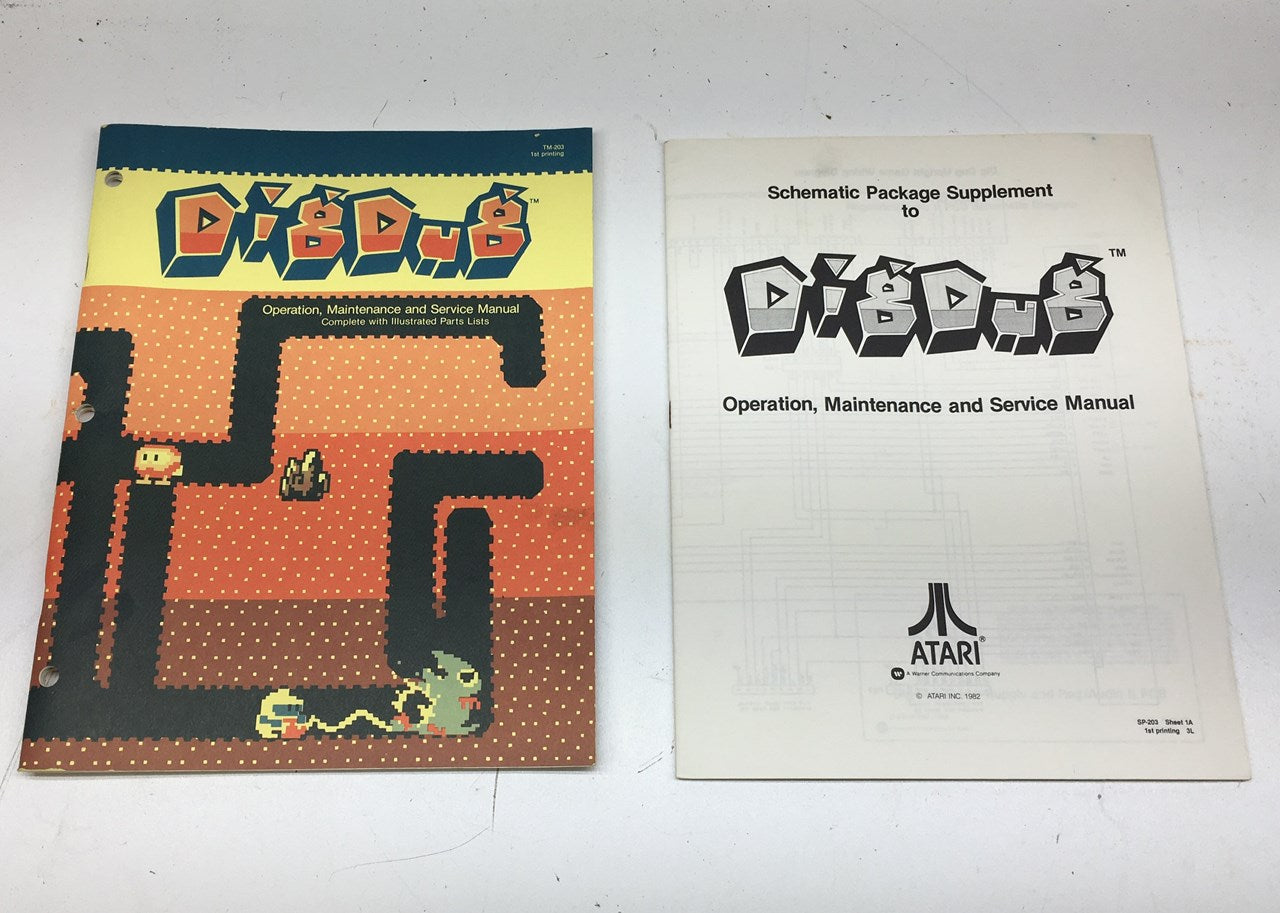 Atari Dig Dug Operation, Maintenance and Service Manual, complete with Illustrated Parts Lists. Also included is the pull-out Schematic Package Supplement to the manual.