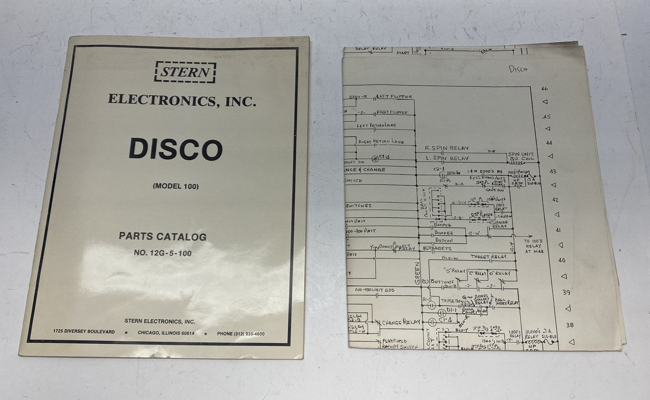 Original Stern Disco pinball machine Parts Catalog in good, used condition. Also includes pull out schematics.