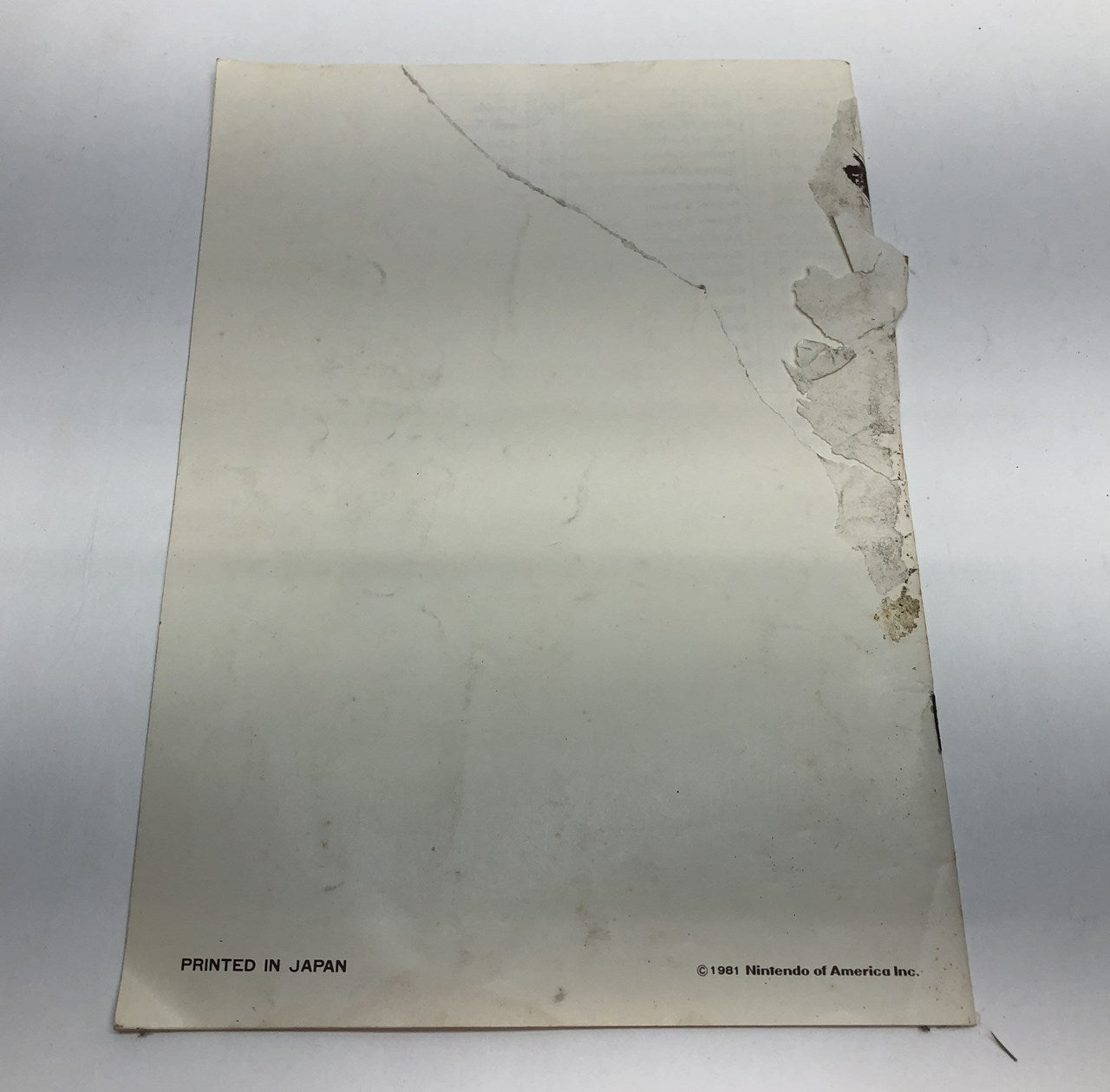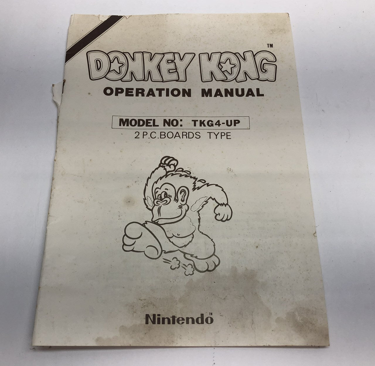 Nintendo Donkey Kong Operation Manual for the upright version of the game in used condition. This particular manual is missing part of its back cover and has a stain on the front cover on the bottom.