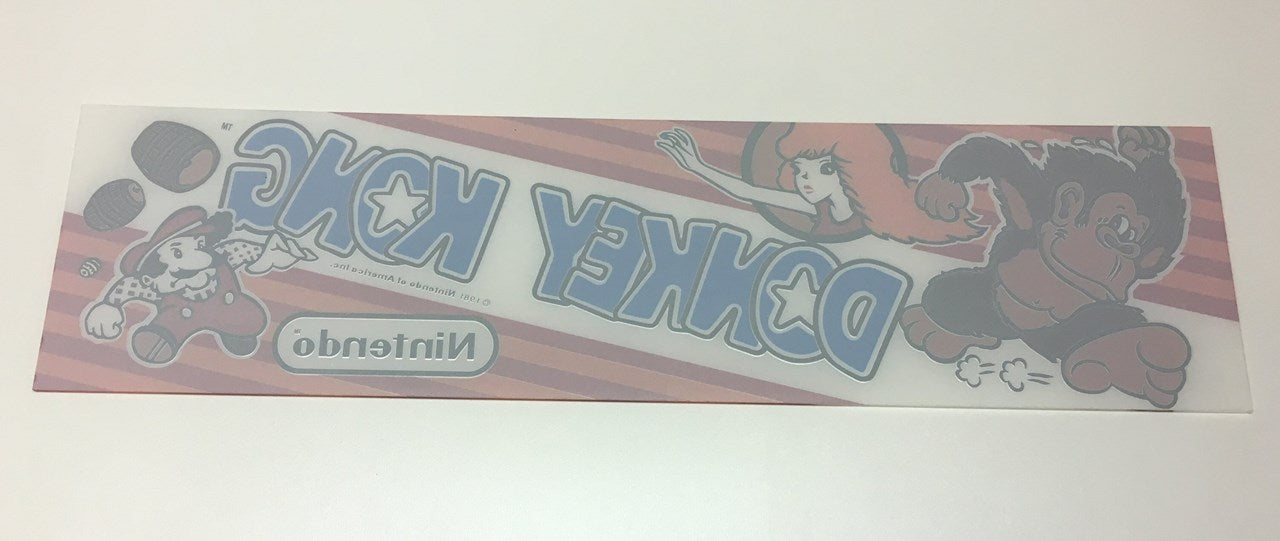 Reproduction plexiglas Nintendo Donkey Kong upright arcade game marquee. Marquee measures 22 3/8" wide by 5 7/8" tall x 1/8" thick to match the original size marquee of Donkey Kong cabinets (also the same size as DK Jr. and Popeye marquees).