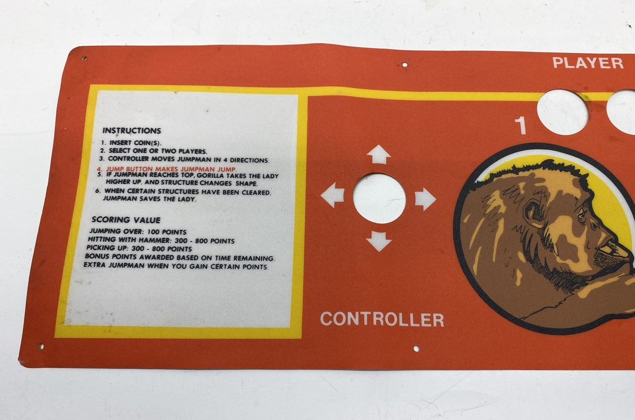 Original, new old stock (NOS) Donkey Kong upright arcade game vinyl control panel overlay. This CPO was made by Willis, considered an aftermarket piece, not an original Nintendo version. CPO has some light wear, but shows fairly well. Would look nice framed as wall art or could still be used on a game.