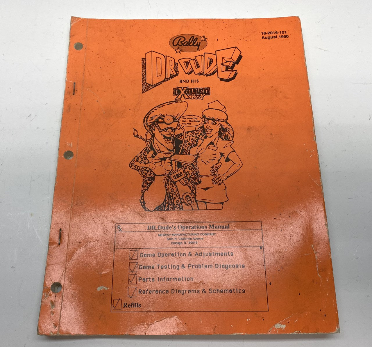 Original Bally Dr. Dude pinball machine manual in used condition with some typical lighter wear. Includes game operation, test/diagnostic procedures, parts information and schematics, among other things.