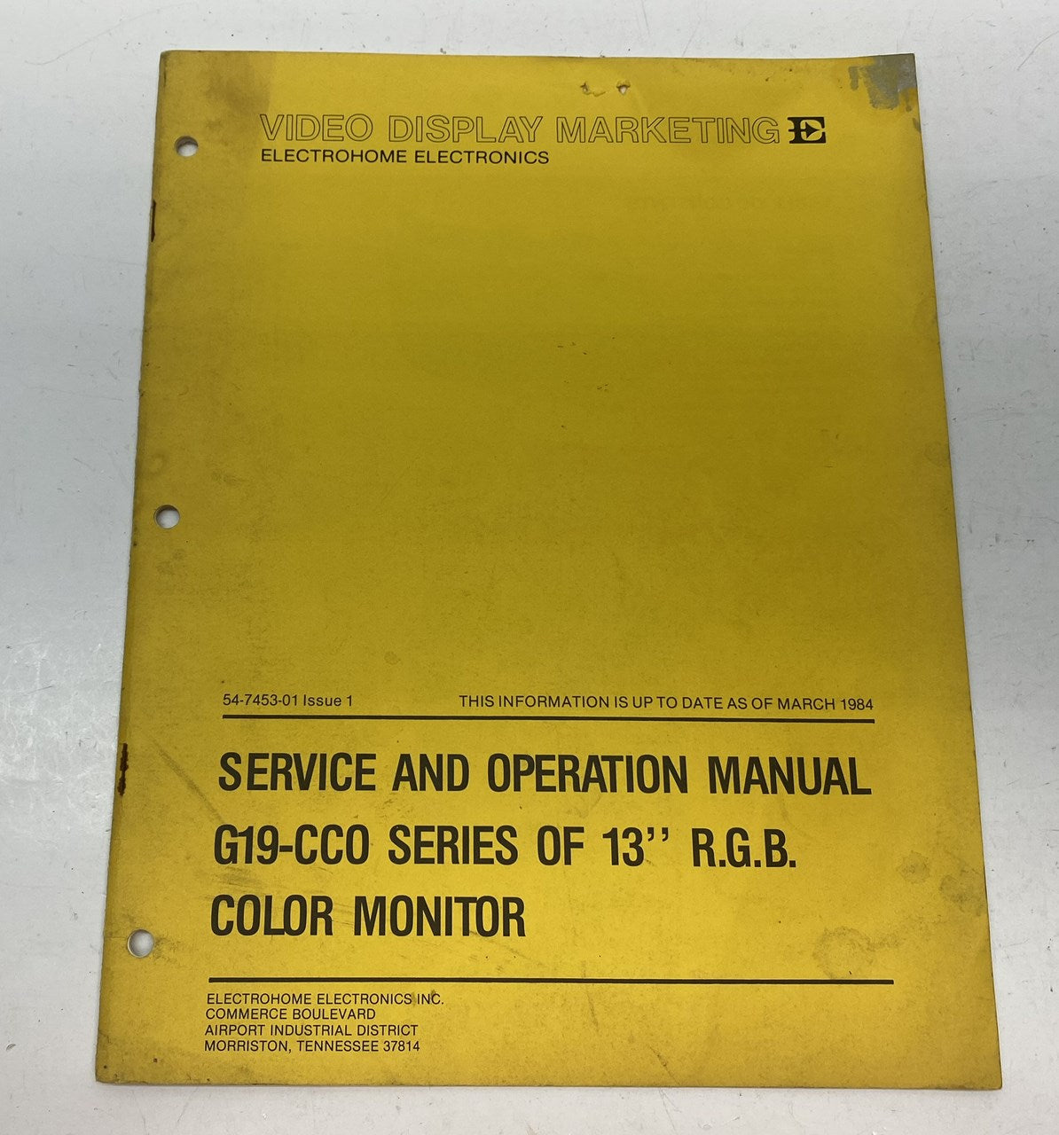 Original Electrohome G19-CC0 13" Monitor RGB color monitor Manual. Service and operation manual includes monitor information, parts lists and schematics.