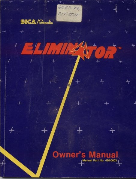 Original Sega Eliminator Owner's Manual. Includes game operating information, parts list and schematics, among other things.