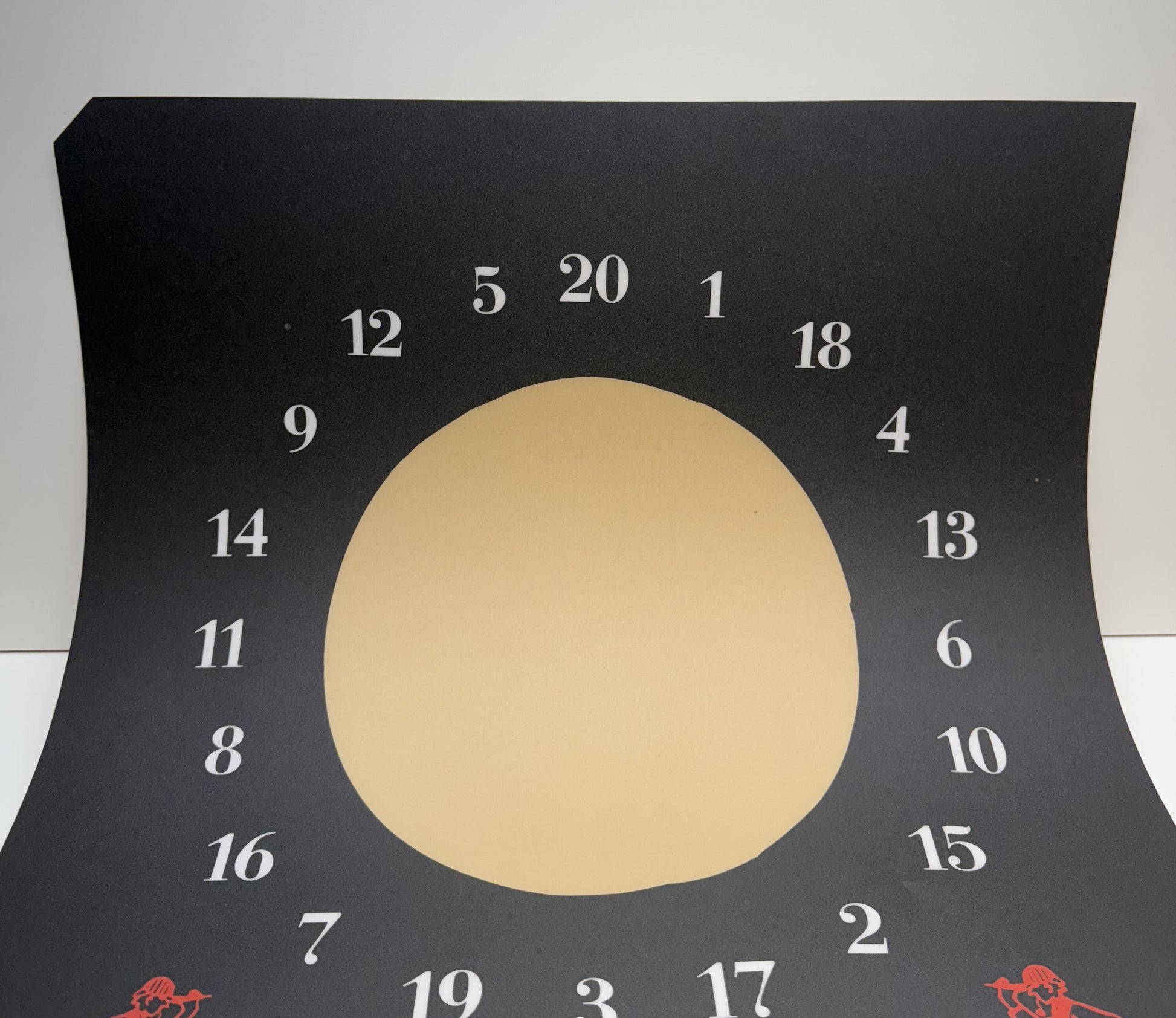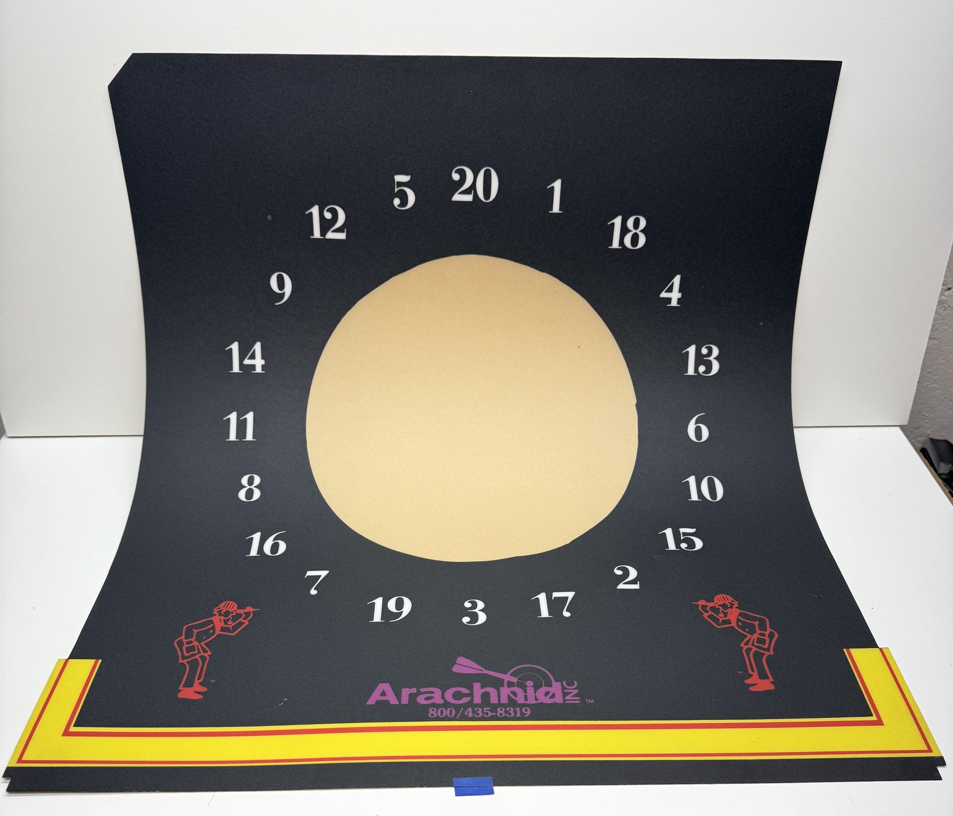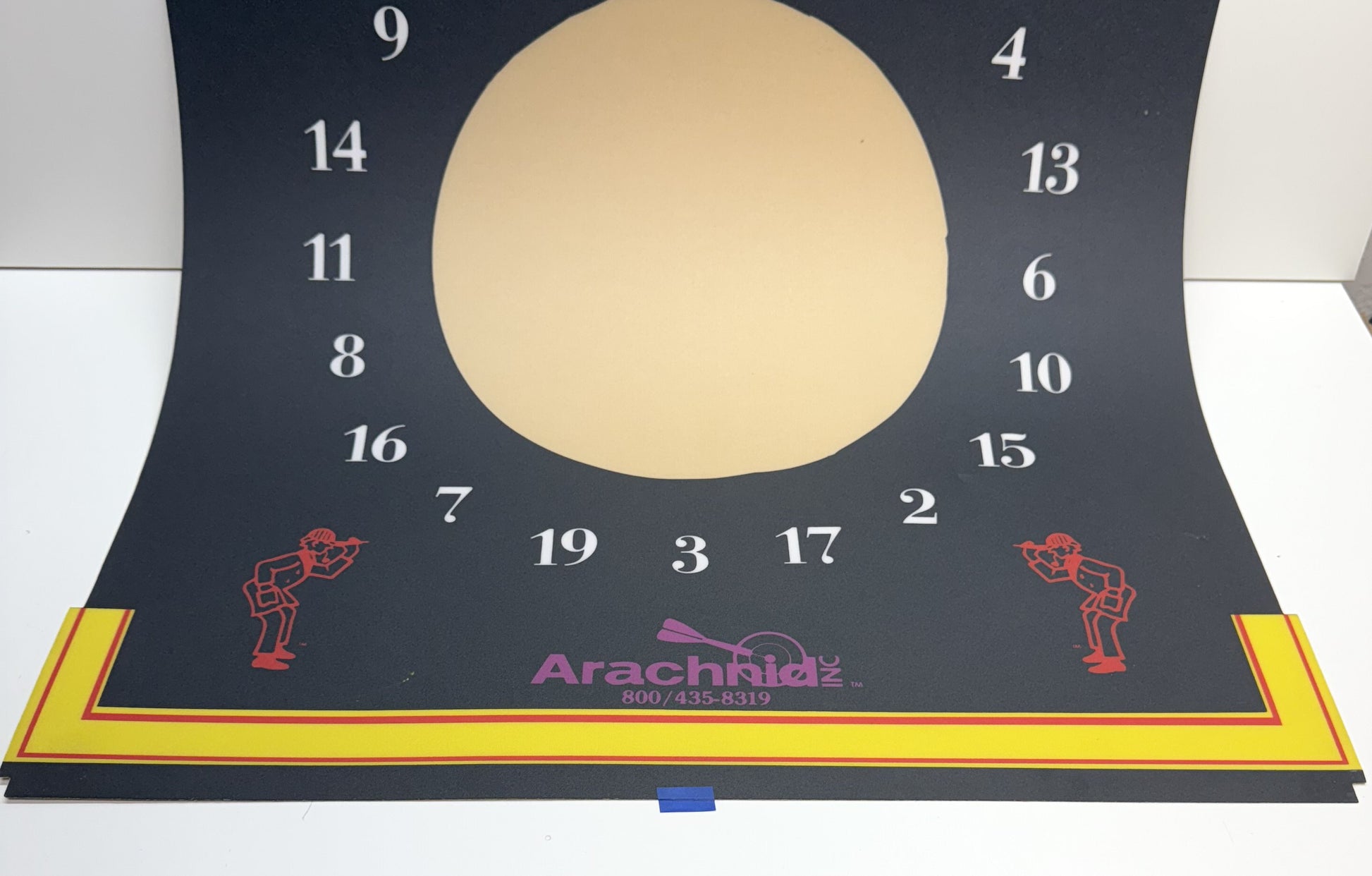Original Arachnid English Mark Darts new old stock (NOS) arcade game artwork for the front of the game around dart board. This is original art (not a reproduction) that has never been used. We are not sure what game(s) used this artwork, we believe it was a version of English Mark Darts, but could be from another Arachnid game.