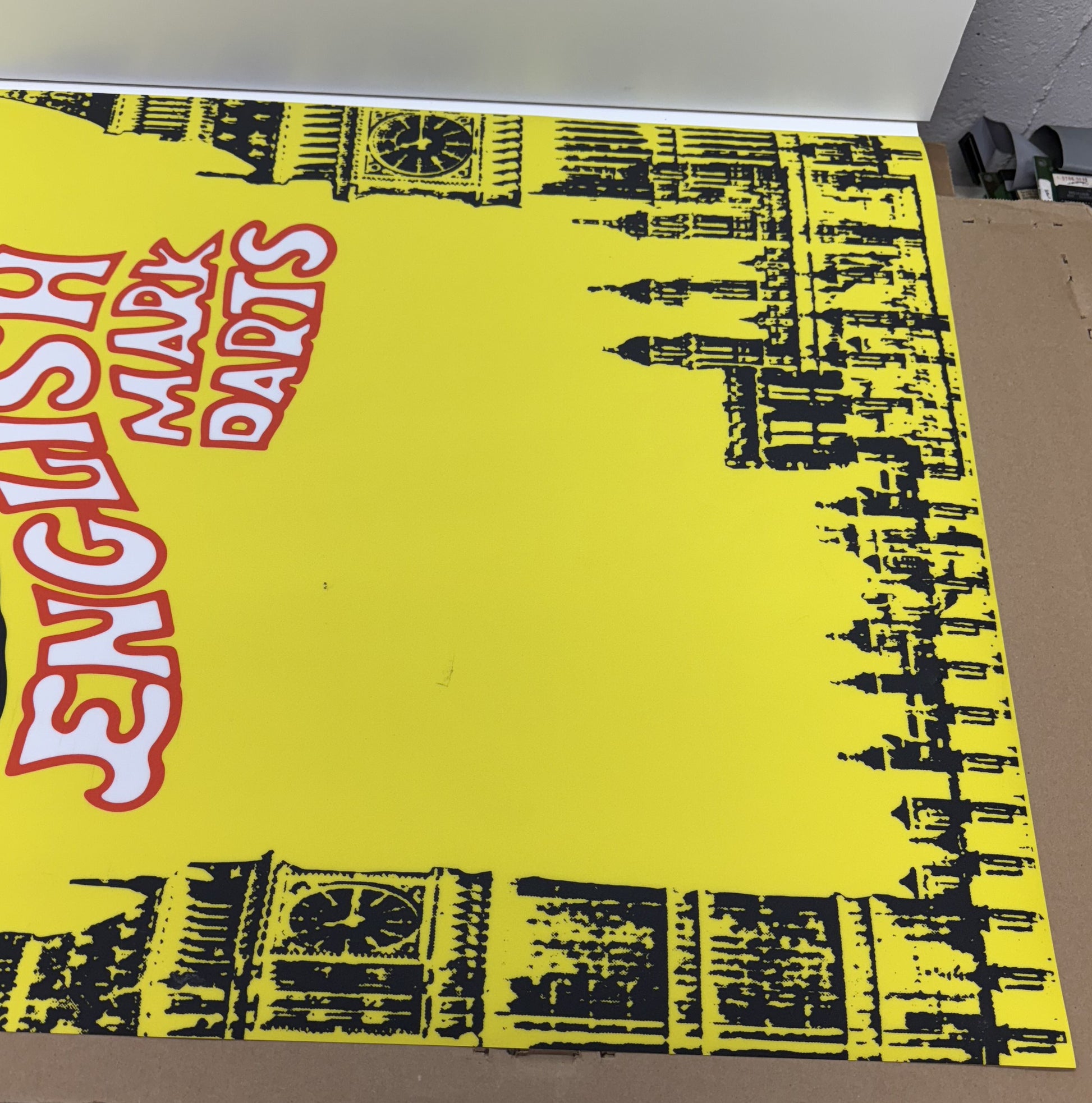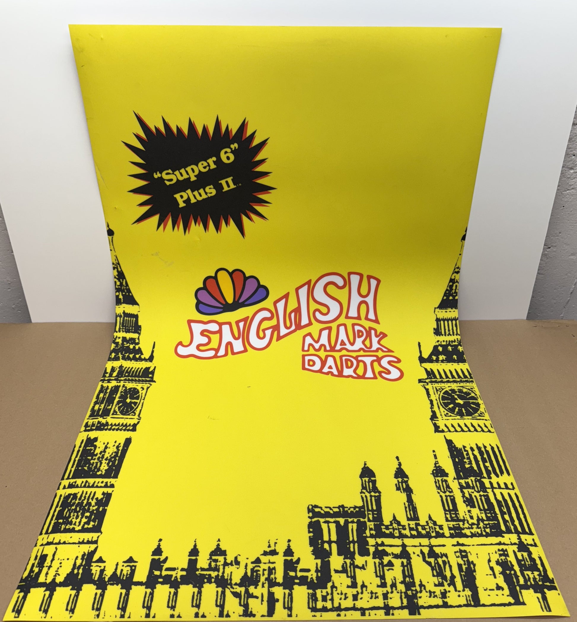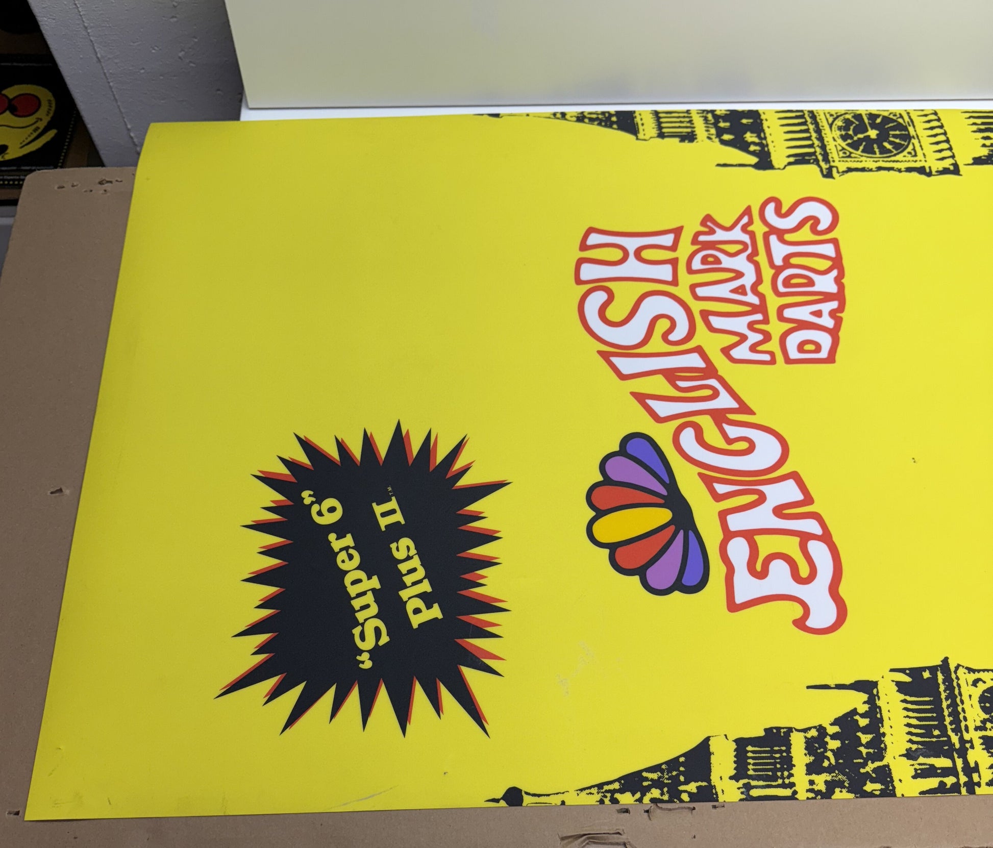 Original English Mark Darts new old stock (NOS) arcade game artwork for the front of the game. This is original sideart (not a reproduction) that has never been used. We believe this is applied to front of English Mark Darts Super 6 Plus II arcade games.