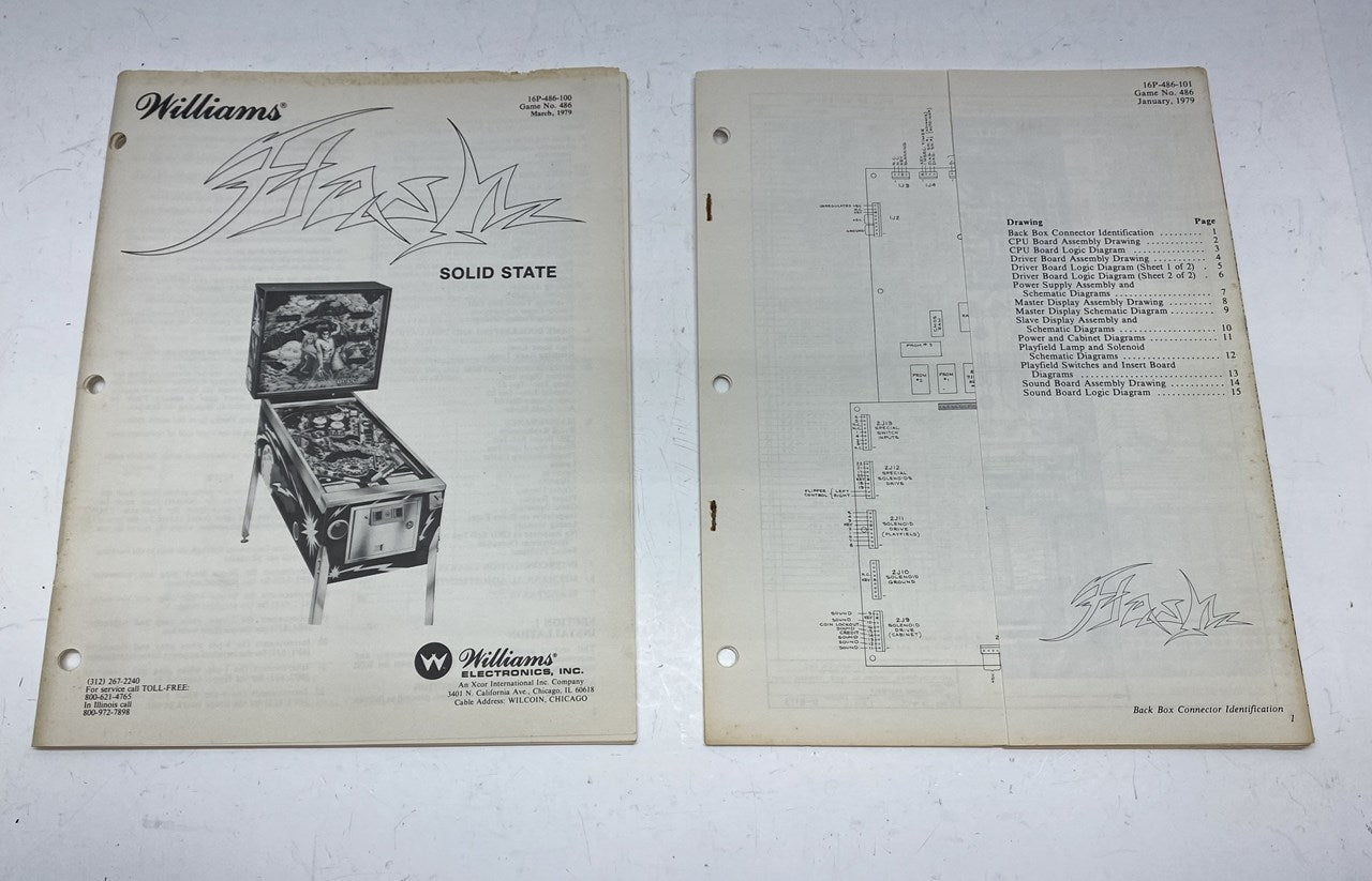 Original Williams Flash Solid State pinball manual in used condition with some wear. Includes game operation, game adjustments, bookkeeping and maintenance information. Also includes the original schematic package.