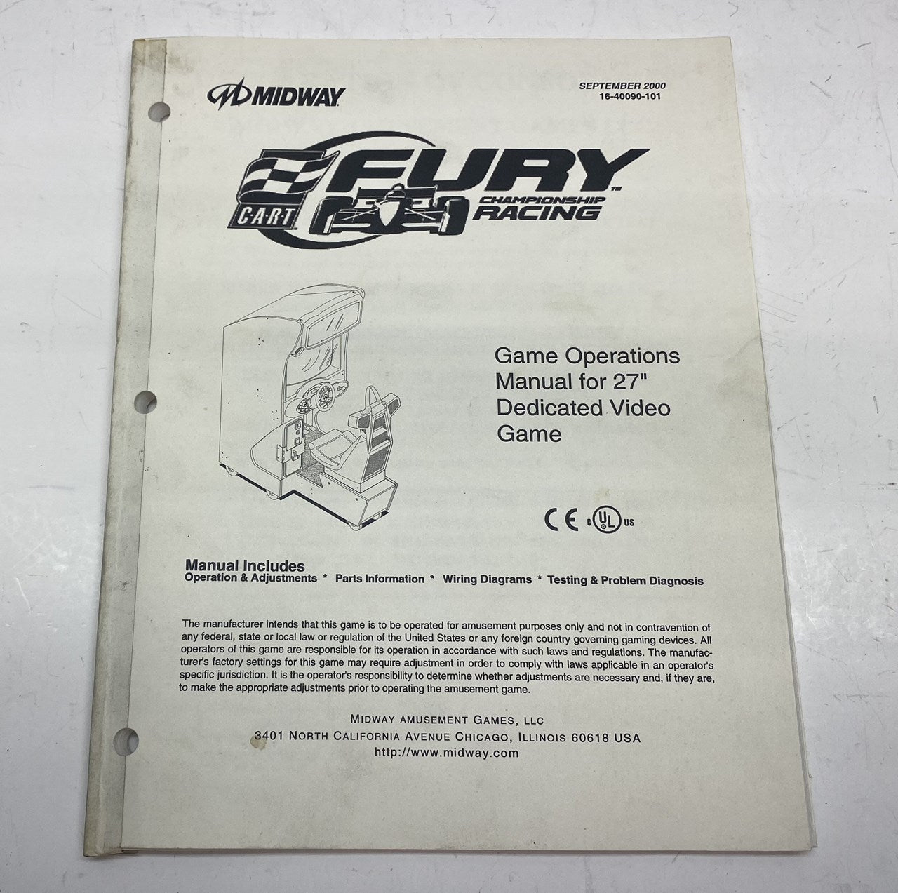 Original Midway Cart Fury Championship Racing Game Operations Manual for 27" Dedicated game. Manual includes game operating information, parts lists and wiring diagram among other information.