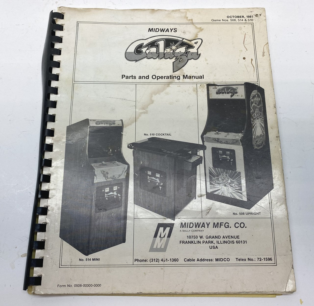 Midway's Galaga Parts and Operating Manual in good condition with some cover wear. Includes game operating information, parts lists and schematics, among other information.