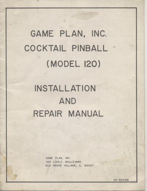 Original Game Plan, Inc. Cocktail Pinball (Model 120) Installation and repair manual in good condition.