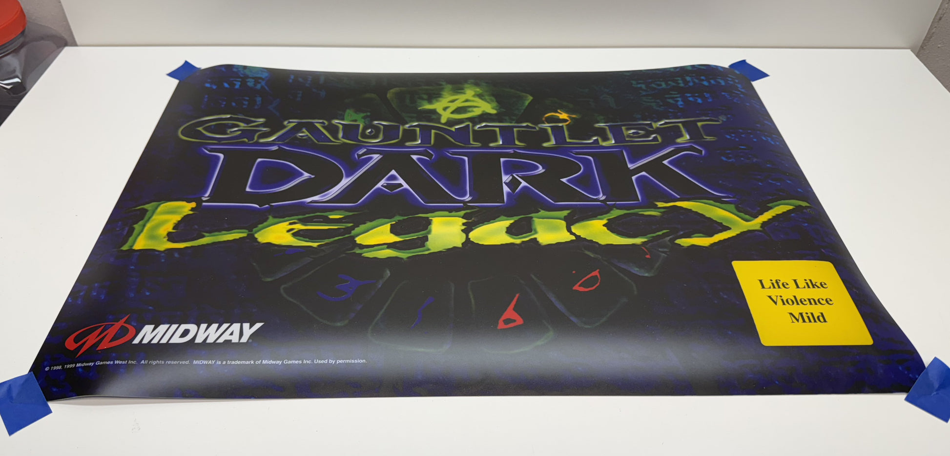 New old stock Atari Games Gauntlet Dark Legacy marquee. This is original vinyl marquee (not a reproduction) that has never been used. We believe this is for the dedicated version of the game. Item was stored rolled and will need to be flattened prior to application (see pictures).