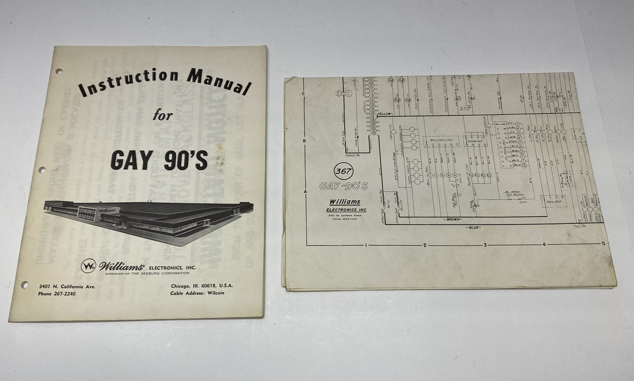 Original Williams Gay 90's pinball machine manual in good, used condition. Includes the manual and schematic package.