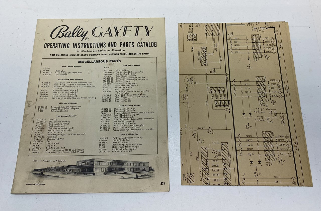 Original Bally Gayety Service and Operation Instructions manual in used condition with some typical wear. This listing also includes the large fold out wiring diagram / schematic sheet.