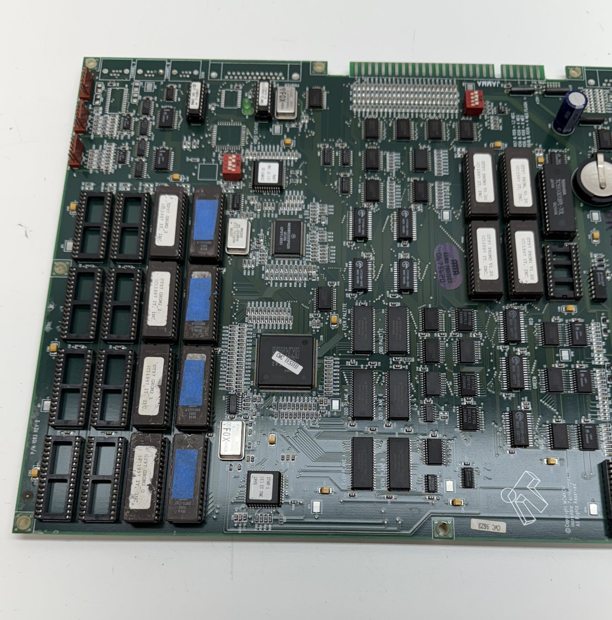 Original Incredible Technologies Golden Tee '97 Jamma circuit board that does NOT work. This does boot up but resets fairly quickly after power-up. We noticed some video issues at times as well. Board is sold for parts or repair. We have done no troubleshooting.