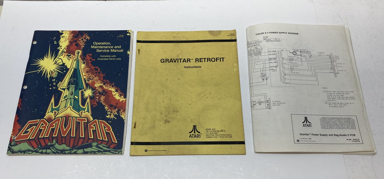 Original Atari Gravitar Operators Manual with Illustrated Parts List. Also includes retrofit manual and schematic package, which is missing its front cover page, but otherwise complete (all of the important info is still intact).