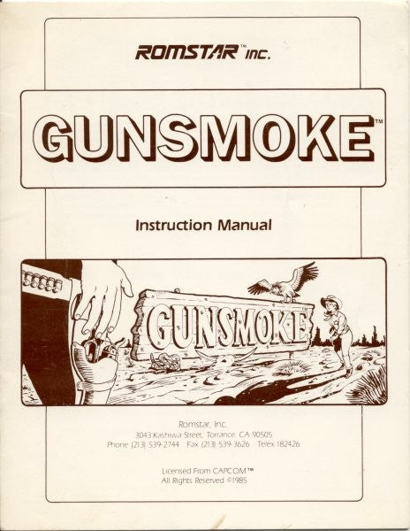 Romstar/Capcom Gun Smoke arcade game manual. Includes game wiring and operating information among other things.