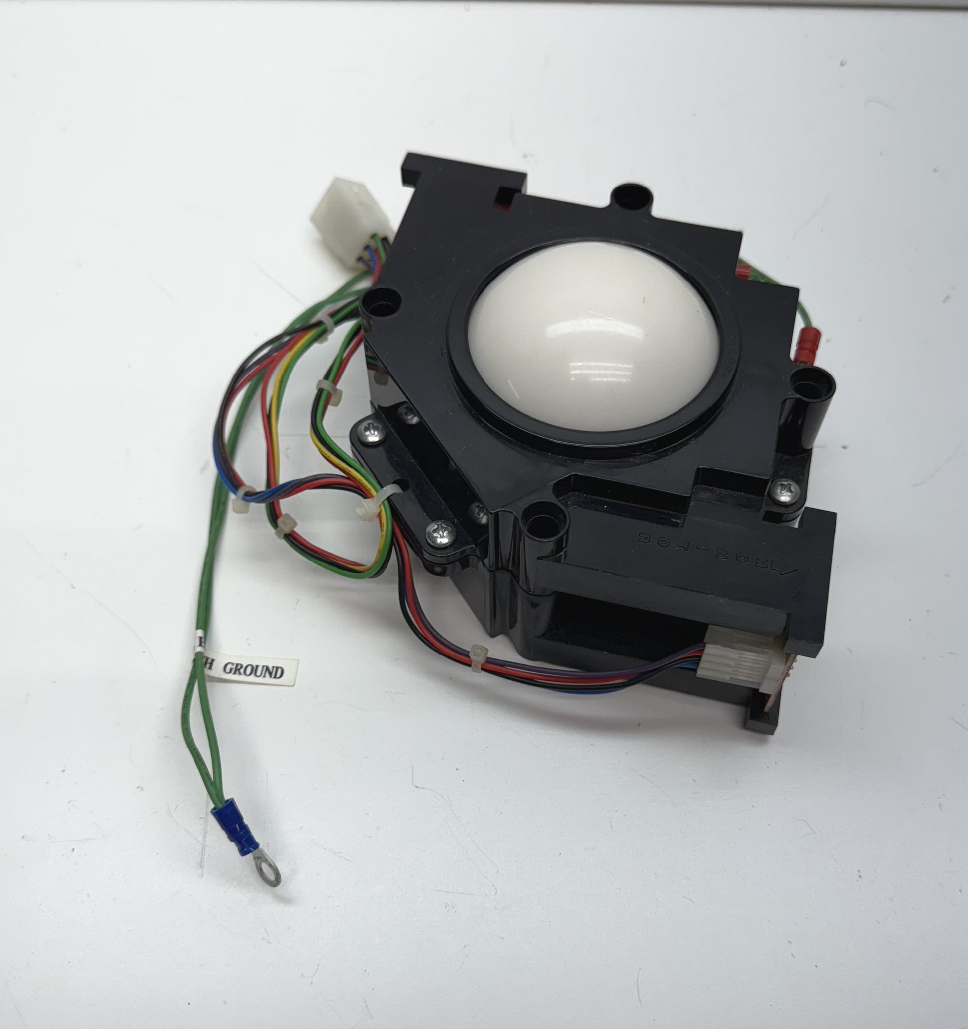 Used, tested and working Happ Controls 3" White trackball controller in good condition. This one works pretty well, spins and is fairly clean. The ball has some discoloration, but it does work. It is a used trackball.