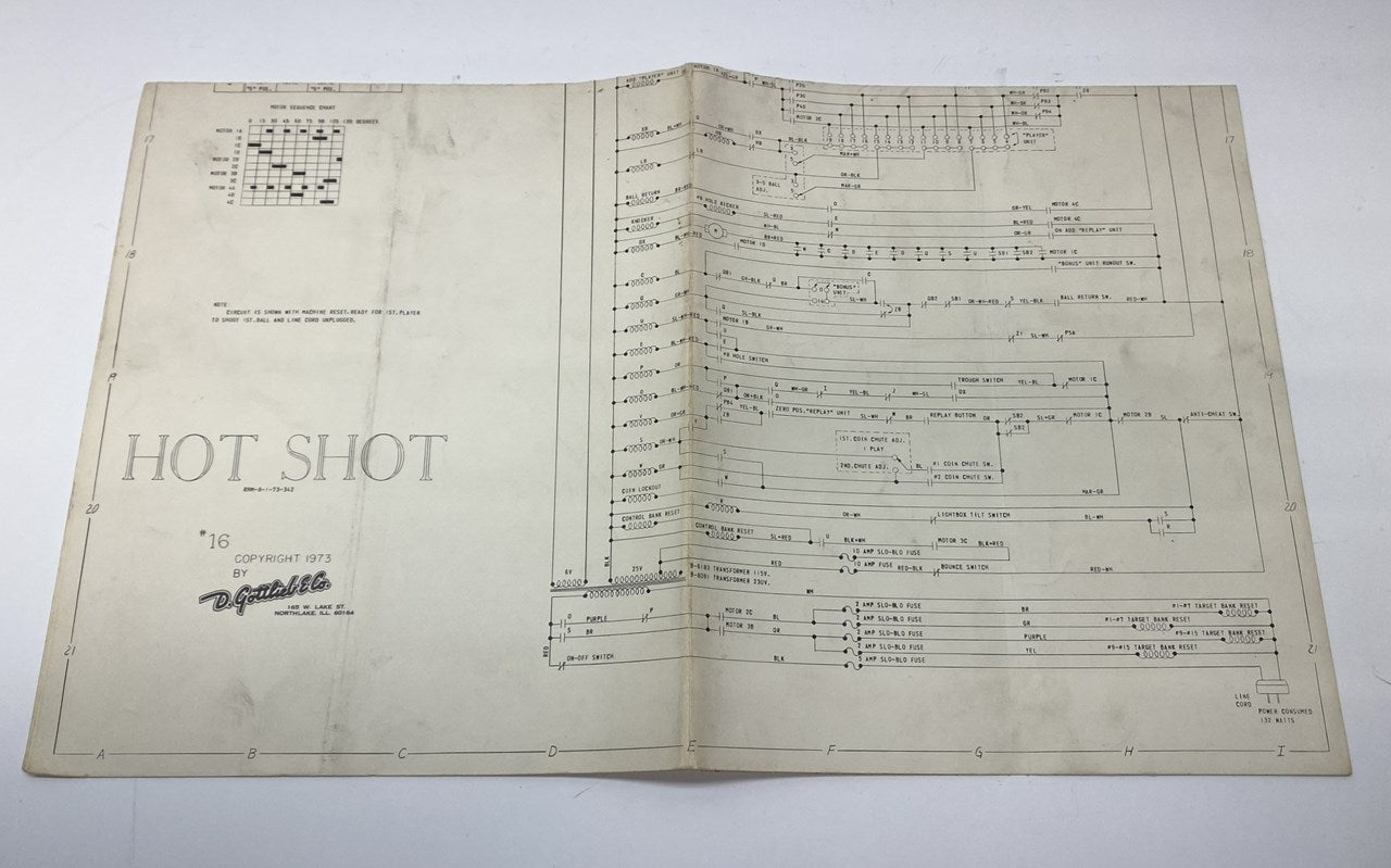 Original Gottlieb Hot Shot pinball machine schematic/wiring diagram from 1973.