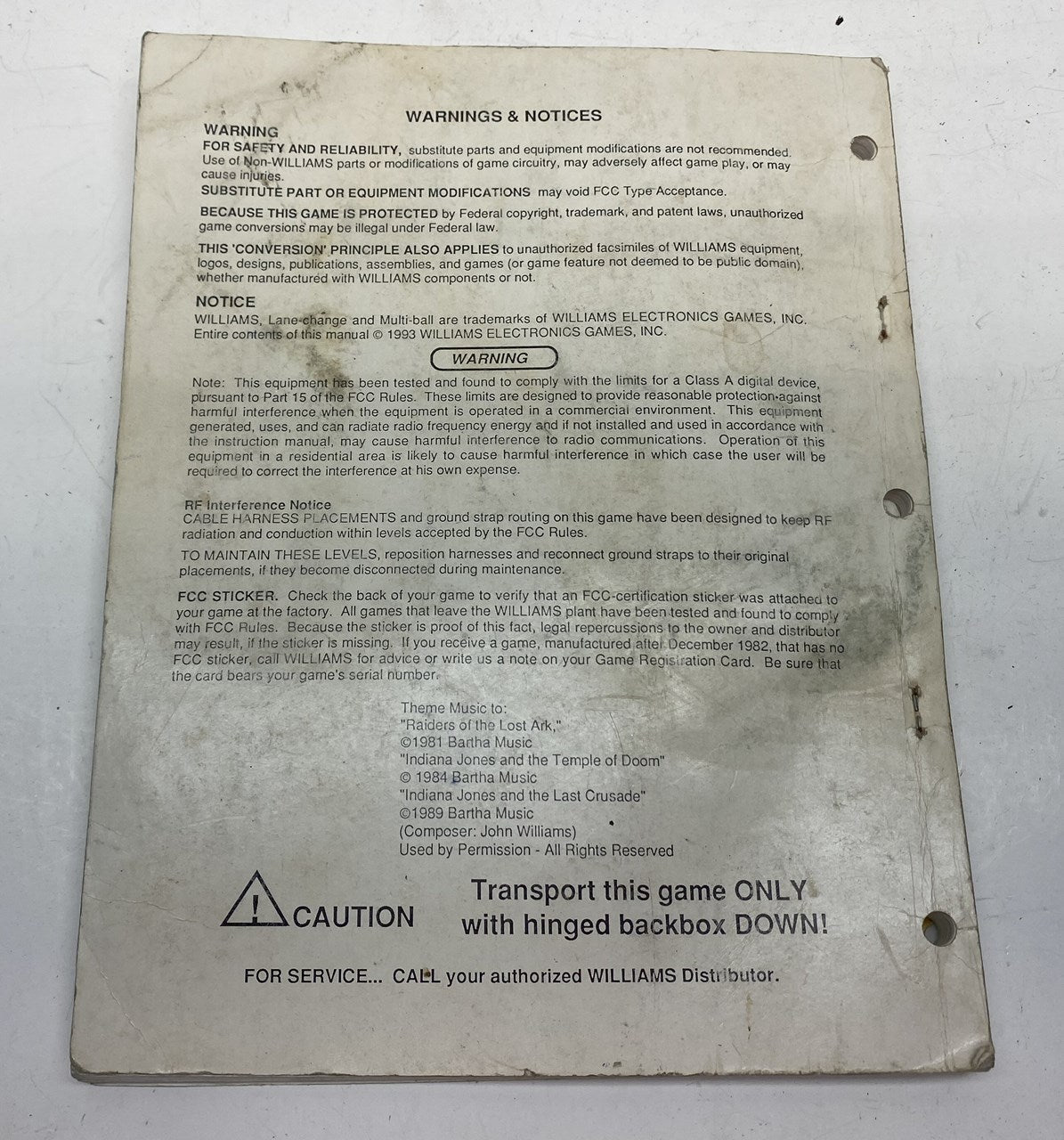 Original Williams Indiana Jones pinball machine manual in used condition with a bit of cover wear. Manual is complete legible, just has some cover wear and wear on the first few pages.