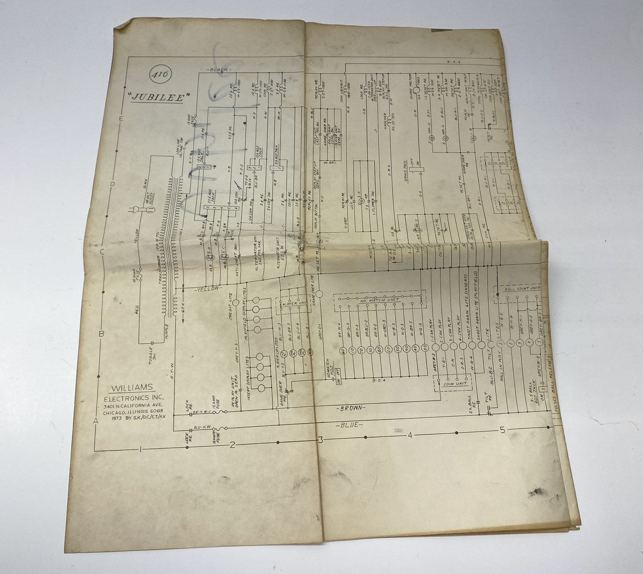 Original Williams Jubilee pinball machine schematic / wiring diagram in used condition from 1973.