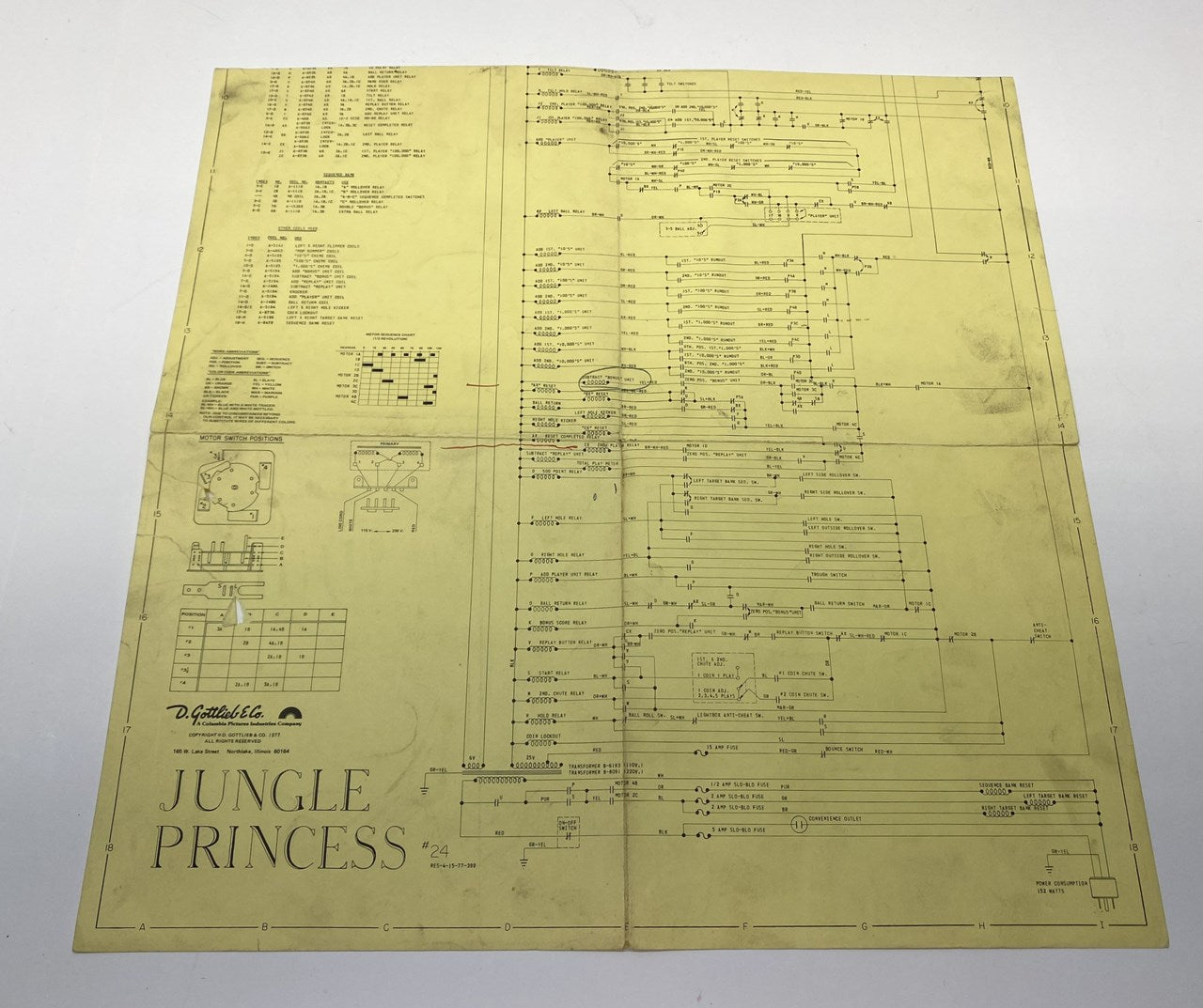Original Gottlieb Jungle Princess pinball machine schematic/wiring diagram from 1977.