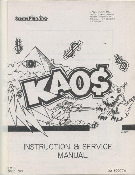 Origianl Game Plan Kaos arcade game instruction and service manual in good condition.