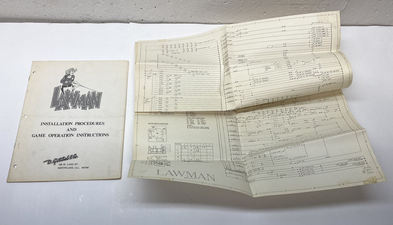 Original Gottlieb Lawman pinball machine manual with pull-out schematic sheet in used condition from 1971.