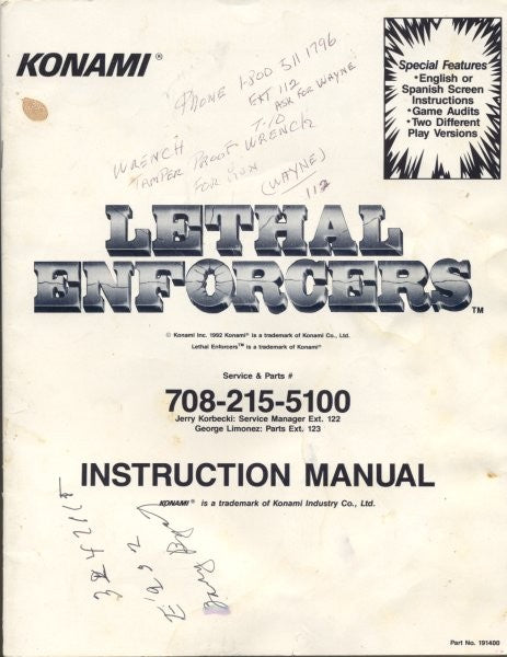 Original Konami Lethal Enforcers Instruction Manual in good condition.