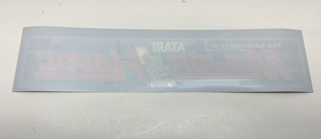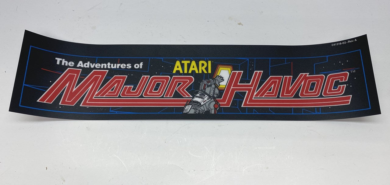 Reproduction Atari Major Havoc dedicated upright, vinyl arcade game marquee underlay. We found this item in a bulk buy, appears to be a nice reproduction from quite a few years back. Item is in very nice condition, it was never used on a restoration. It is a vinyl marquee for the dedicated Major Havoc game designed to go behind a piece of glass.
