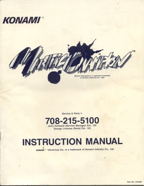 Original Konami Martial Champion arcade game manual. Includes game operation information, parts lists and schematics among other information.