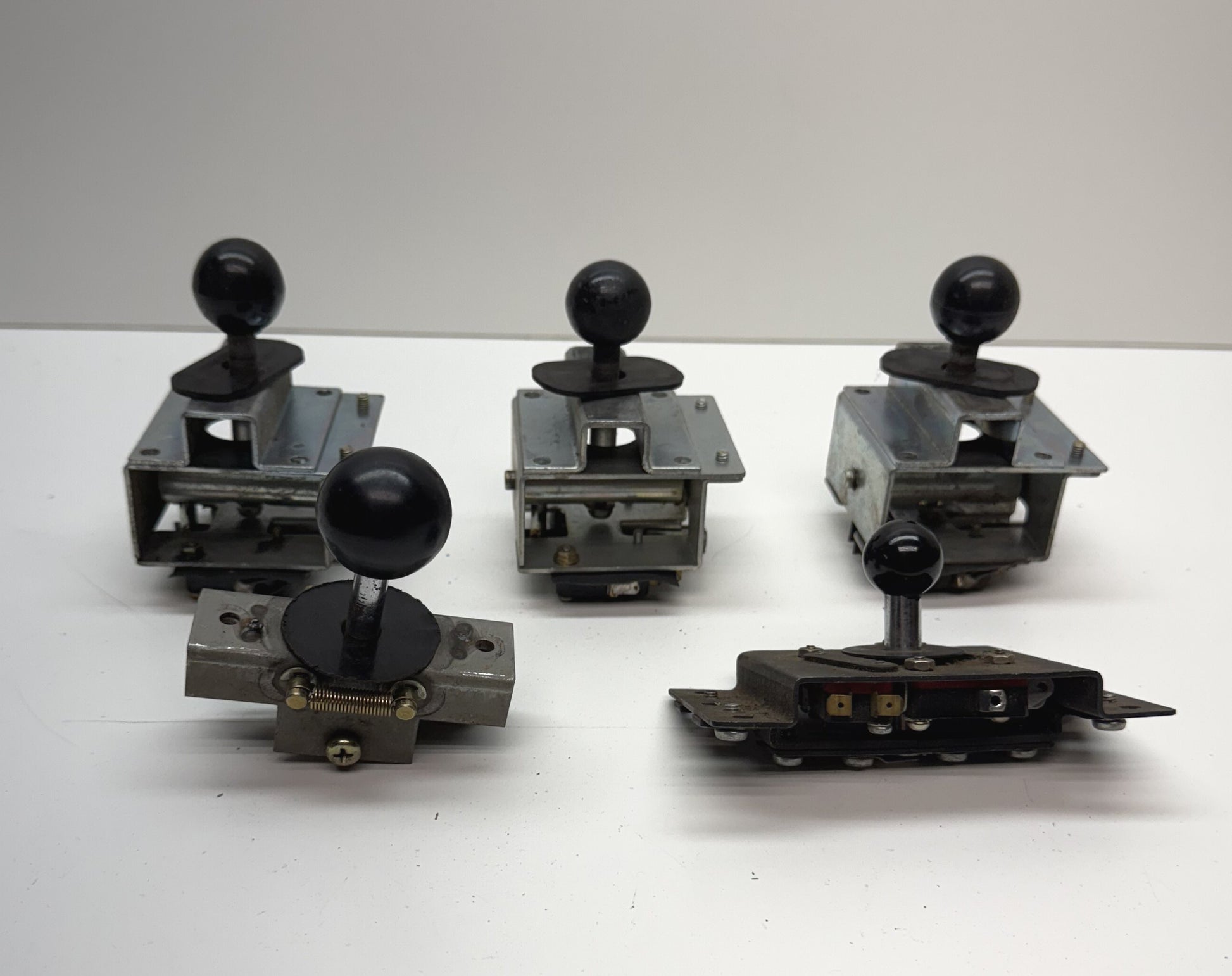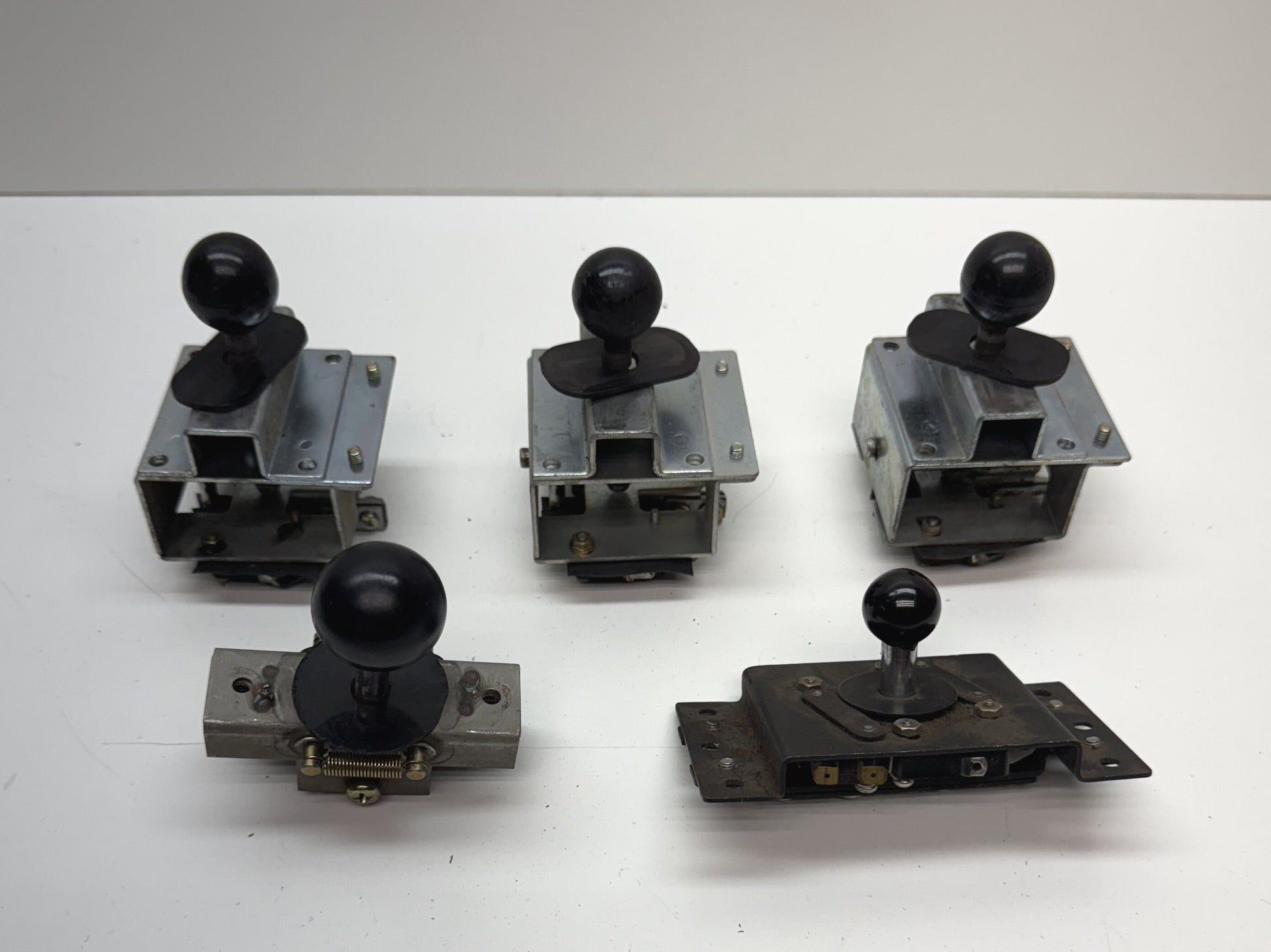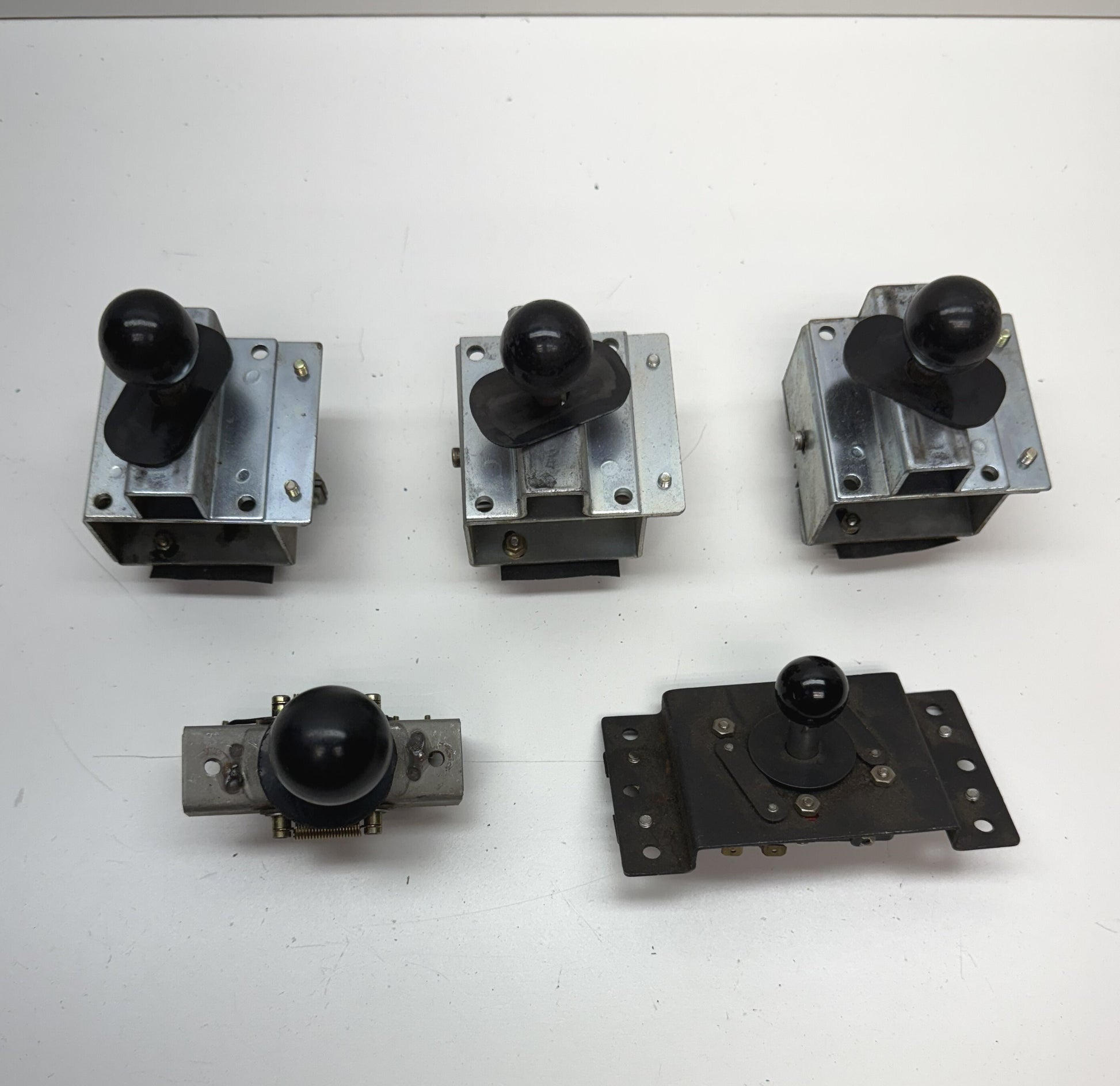 Lot of five assorted metal microswitch joysticks that look to be from the early 1980s. There are four 2-way joysticks (three of the same type) and one 4-way joystick. They all appear to be complete, movement is a little loose on the some of them, but they do appear to be move as they should.