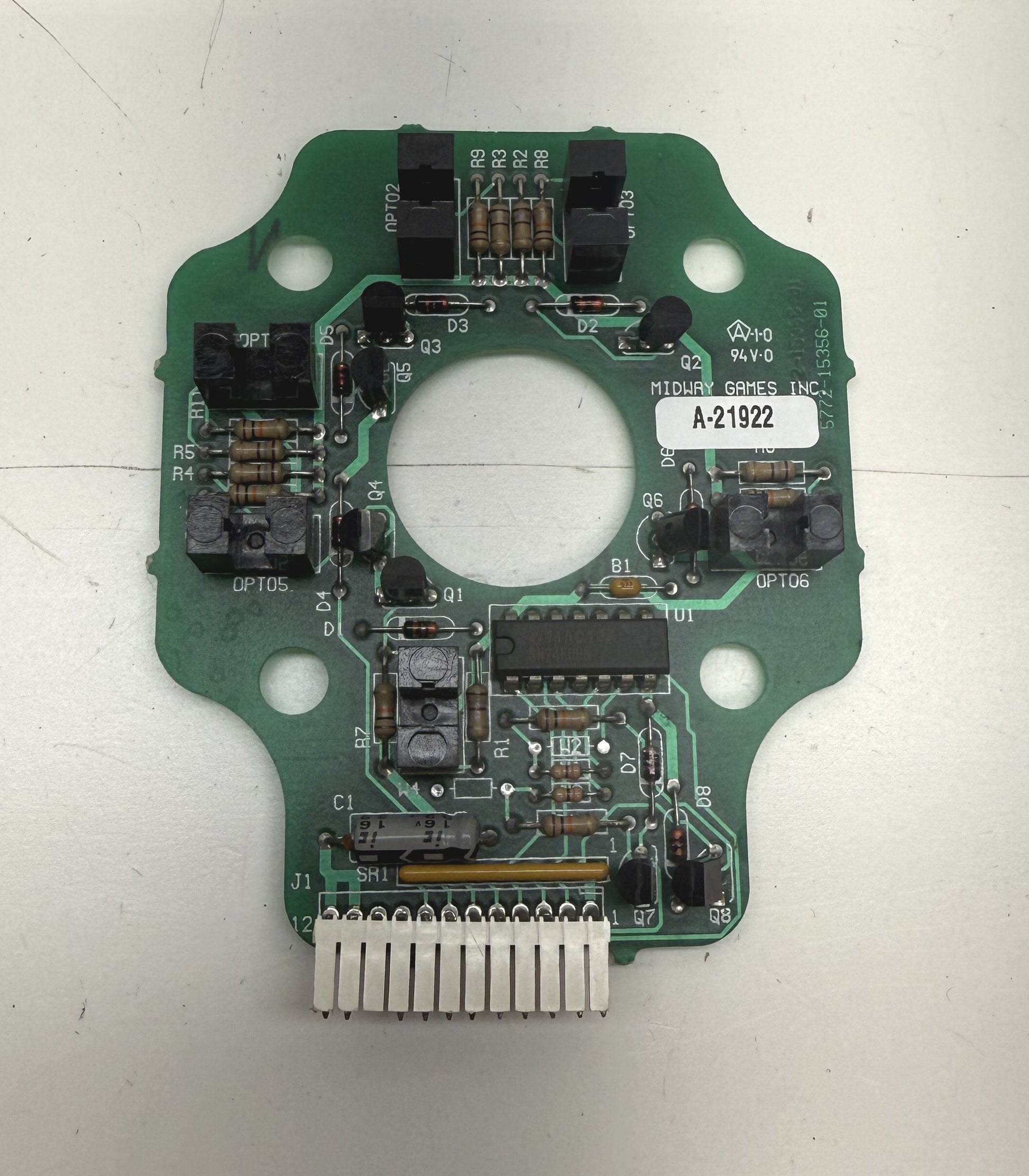 Original, Midway 49-way optical joystick circuit board used on NFL Blitz and Gauntlet Legends game, among others. Board has been tested and works fine.