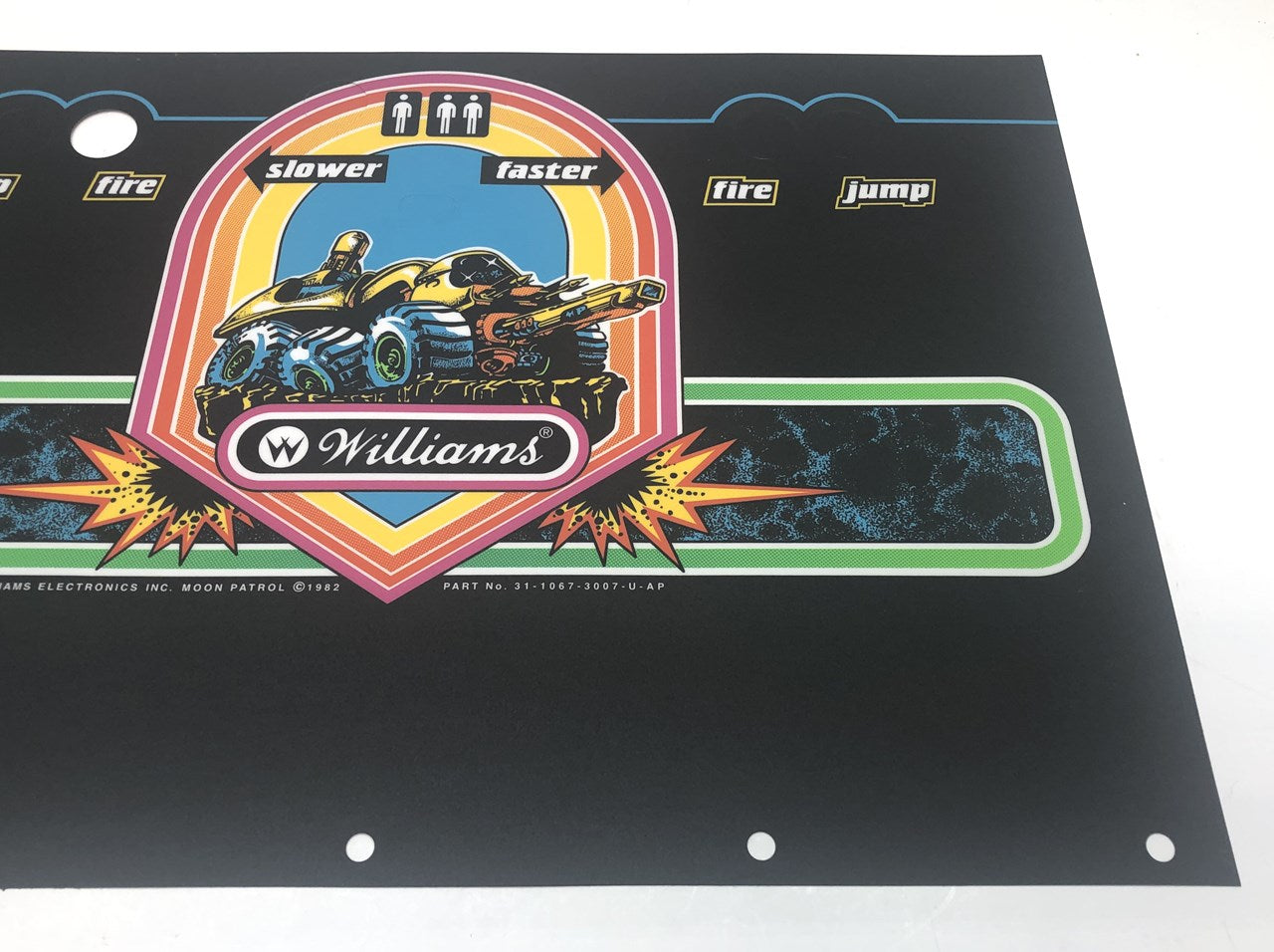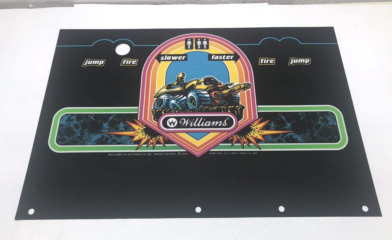 Williams Moon Patrol upright arcade game screen printed, reproduction control panel overlay. This reproduction was made about 10-15 years ago, we purchased it at the time for a restoration, but never used it. It is well done screen printed reproduction, measures 22 7/8" x 15 1/2" and designed for a dedicated Moon Patrol game.