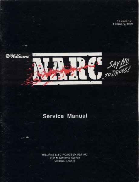 Williams NARC arcade game service manual. Includes game operation information, wiring diagram, game adjustments and much more. Schematics are NOT in this version of the manual.