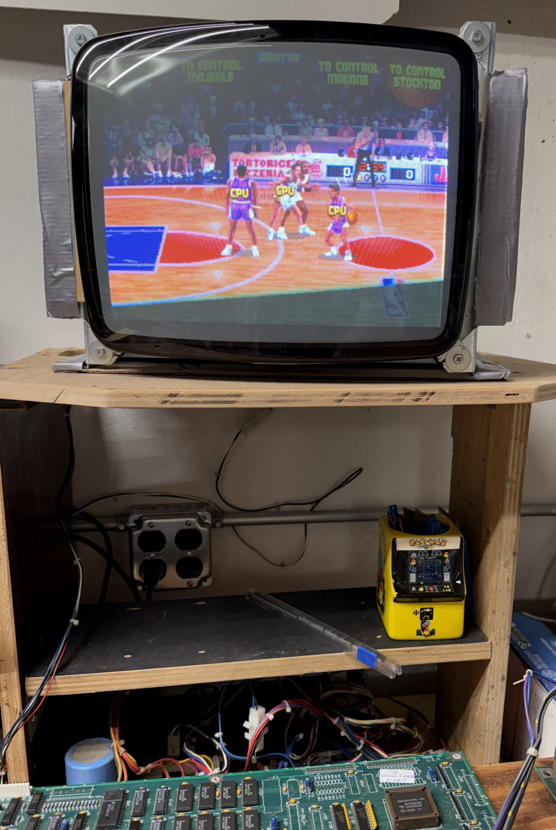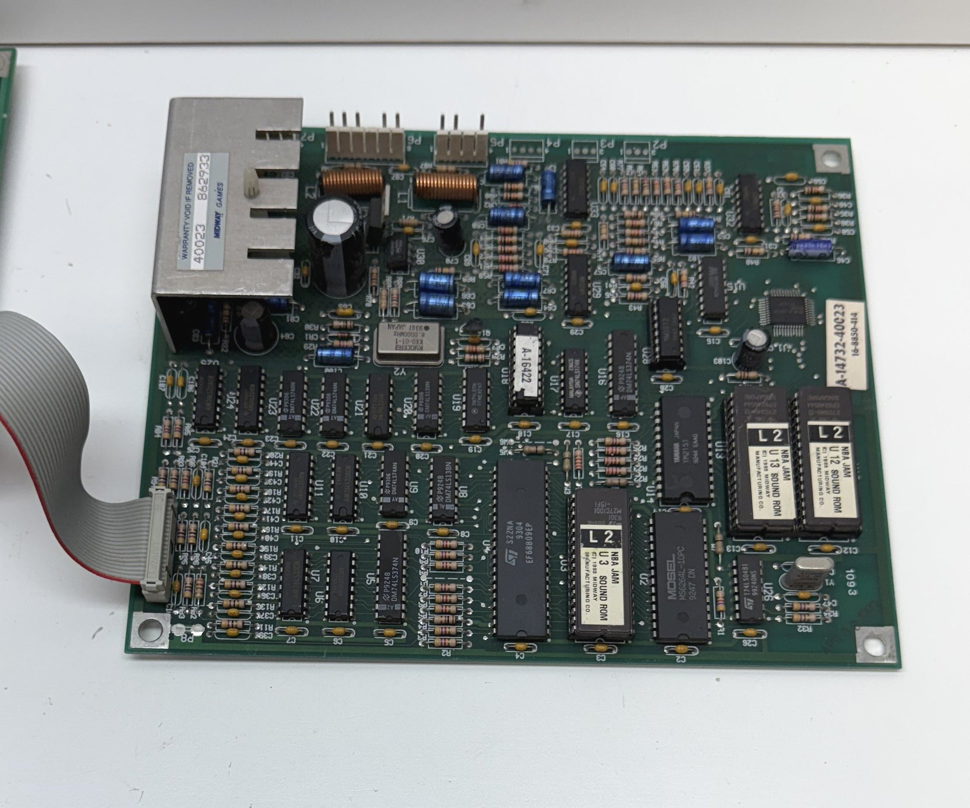 Midway NBA Jam (the original) Jamma+ boardset from 1993. Listing includes the CPU board, sound board, ribbon cable and a new battery for saving scores and game settings. Note that the interboard power cables and sound pot are NOT included. They are needed for sound to work.
