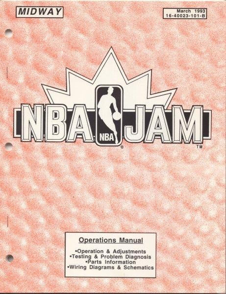 Midway NBA Jam (dedicated version) Operations Manual. This large manual includes installation and operation, testing and problem diagnosis and parts information as well as wiring diagrams and schematics.