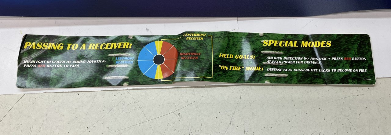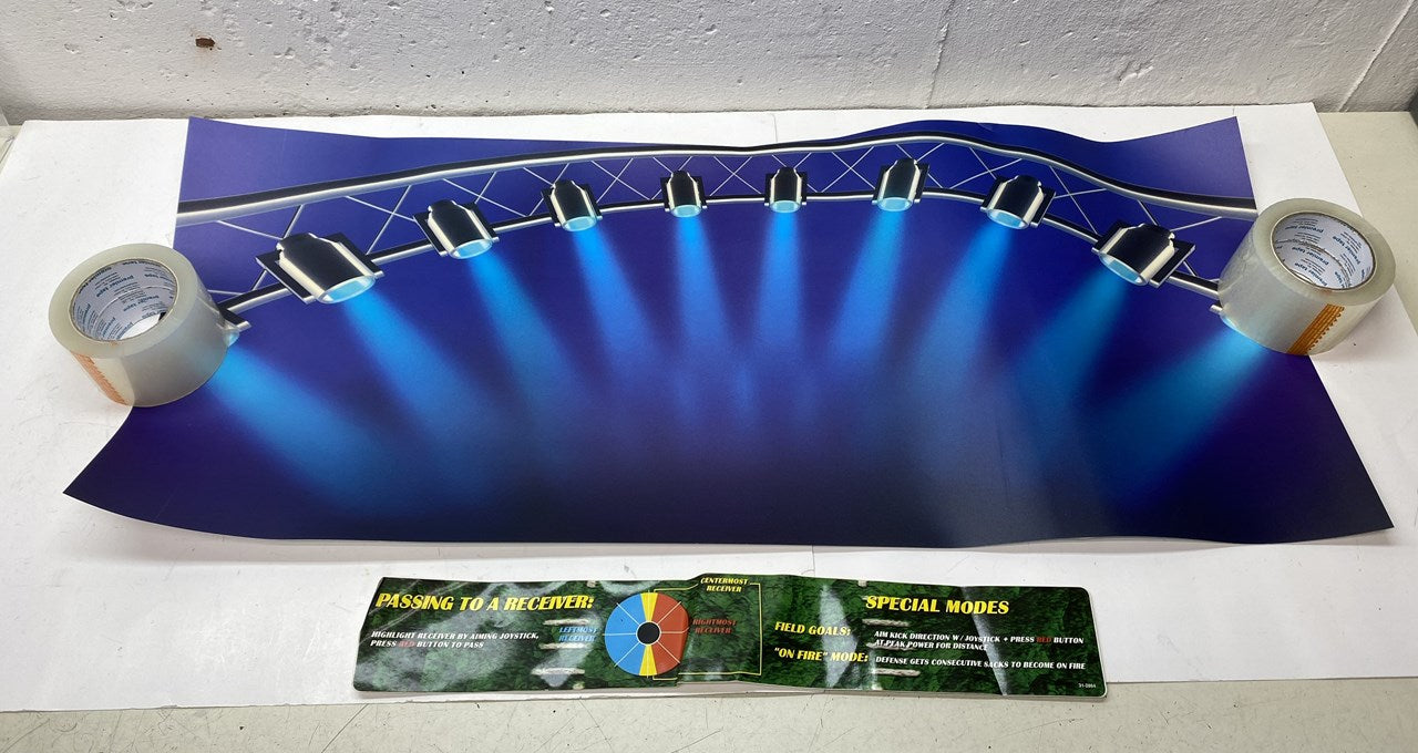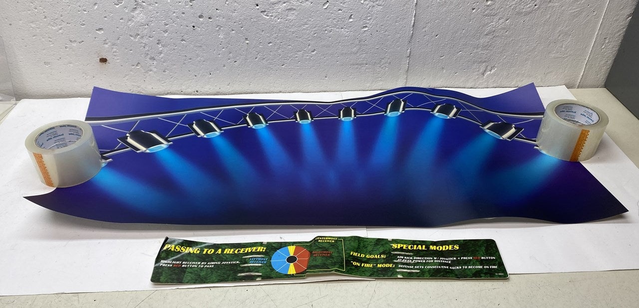 Original, new old stock Midway NFL Blitz '99 control panel artwork. These items were found in a Blitz '99 conversion kit and were never used. Includes the decal sheet for the control panel, a large generic control panel and a bezel decal (with some folds, light wear). Everything should be usable, the generic CPO has a couple of wear spots, but shows well.