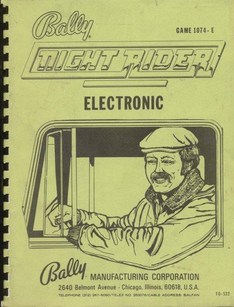 Original Bally Night Rider (electronic version) instruction manual. Includes game operation information, troubleshooting information and parts lists, among other information.
