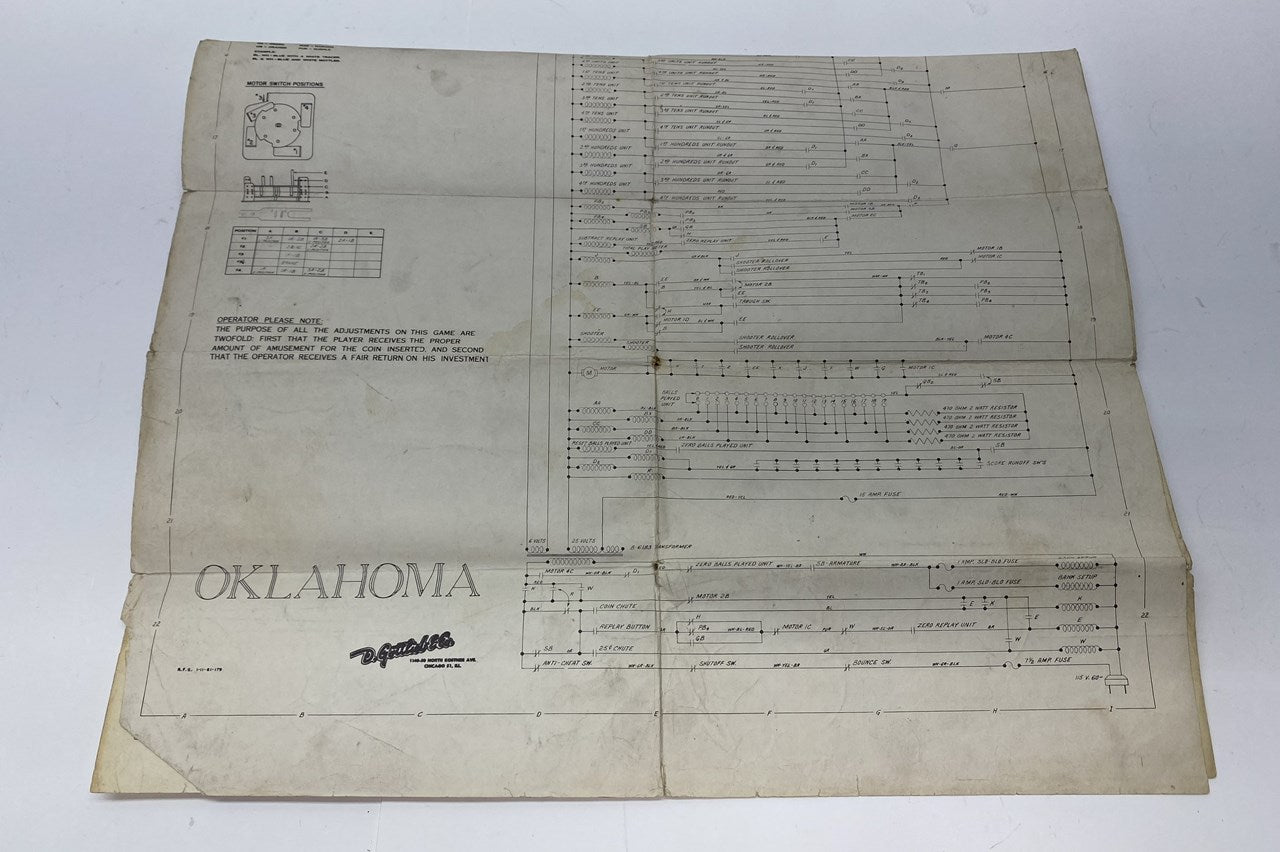 Original Gottlieb Oklahoma pinball machine schematic/wiring diagram with some wear from 1961.